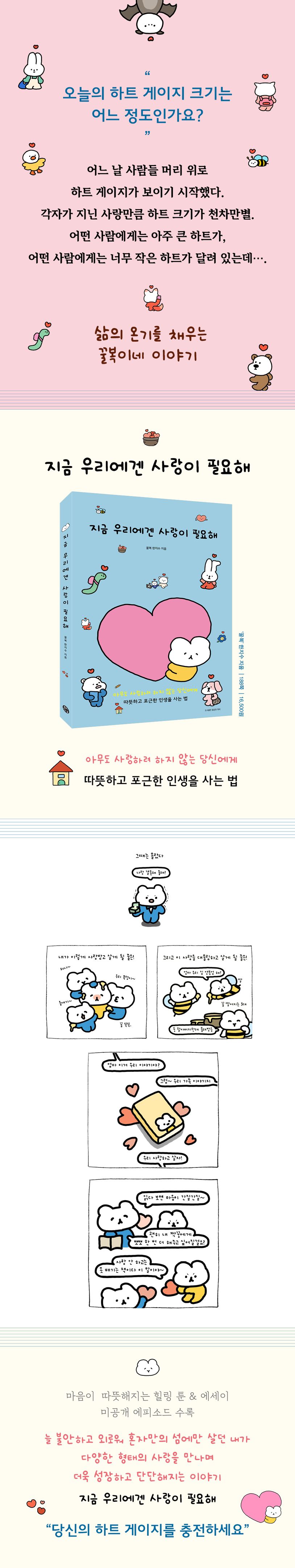 "너를 만나기 전에 나와 지금의 나는 전혀 다른 사람이야." 이 세상에 여러 사람이 살고 있듯 세상에는 다양한 종류와 여러 형태의 사랑이 존재하고 있다. 어릴 때부터 가족에게서 받아 온 사랑, 나와 닮은 듯 다른 반쪽을 만나 키워가는 사랑, 나를 똑닮은 작은 아기를 낳고 키우며 배우는 사랑, 어른이 된 후 새롭게 만난 새로운 가족들과 맞춰가는 사랑 등 우리의 다양한 삶의 단계 속에는 언제나 늘 이전과는 다른 형태의 사랑이 숨어 있다. 그 사랑을 찾아 내 안의 사랑과 온도를 맞추고 무럭무럭 키우는 연습을 하며 우리는 또 한 뼘 더 성장하게 된다. 이 책은 그런 다양한 형태의 사랑을 소개하고 그 속에서 '나'라는 불완전한 개인이 어떻게 얼마나 성장하며 내 안의 사랑을 키워 전하는지를 보여주는 책이다. 아무도 사랑하려 하지 않던 지난 날의 내가 사랑하는 법을 배우고 사랑받는 법을 터득해 인생의 따뜻함과 참된 소중함을 알아가는 책이다. 나를 괴롭히던 마음 속 불안과 외로움이라는 괴물이 이제야 깨달은 사랑에 사르르 녹아 없어질 것이다.