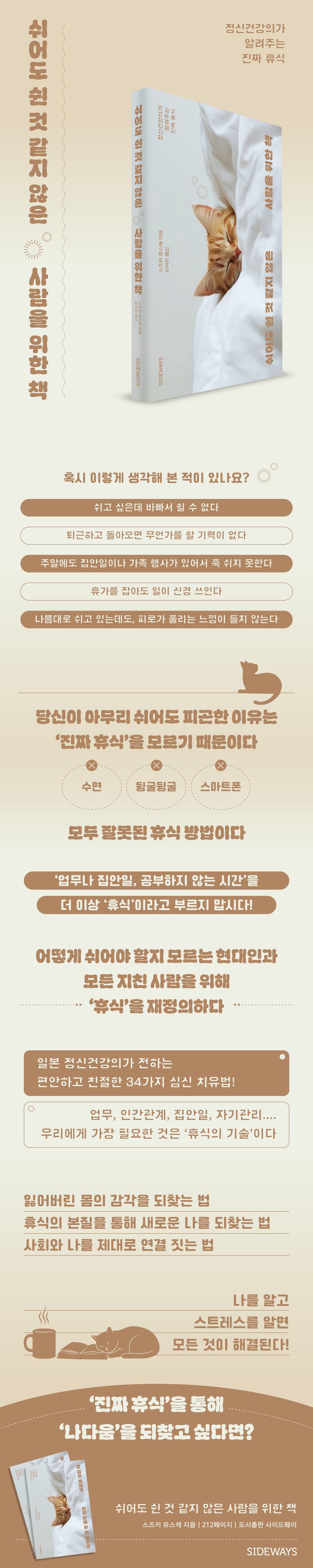 ‘휴식’과 ‘쉼’의 중요성은 누구나 알고 있지만, 이해하고 마음먹은 대로 실천하기란 쉽지 않다. 일본의 정신건강의이자 세이브 클리닉 원장인 스즈키 유스케는 일본 현지에서 8만 부가 넘게 판매되며 정신의학 분야 베스트셀러가 된 이 책 『쉬어도 쉰 것 같지 않은 사람을 위한 책』에서 각각의 스트레스 유형과 이에 따른 신경학적·신체적 반응을 통해 우리 몸에 어떤 일이 일어나는지 파악하고 분석한다. 한스 셀리에, 스티븐 W. 포지스, 리처드 래저러스, 무리 라하드 등 심리, 신경 이론에서 역사적인 기록을 남긴 이들의 연구를 토대로 스트레스와 몸의 상관관계를 설득력 있게 파헤치고, 학문적인 접근은 물론 레지던트 시절부터 전문 상담의 시절까지 망라한 저자 개인의 스트레스 경험과 극복 사례를 고백하면서 독자들의 열렬한 공감을 받았다.