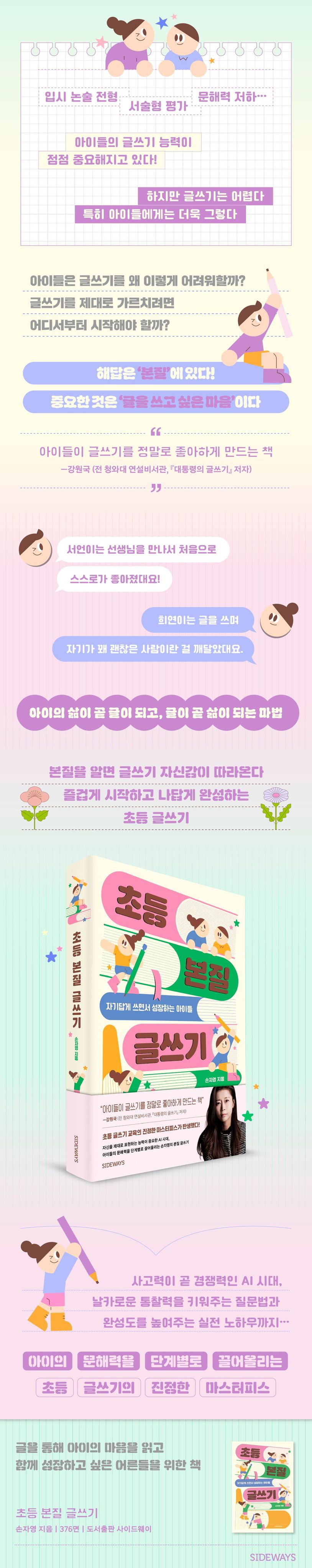 어린이책 편집자 출신의 독서논술 전문가인 저자는 먼저 글쓰기 교육의 본질적인 목표가 무엇인지부터 바로 세워야 한다고 말한다. 보기에 그럴듯한 글을 썼다고 해서 글쓰기를 잘한다고 말하기는 어렵다. 얕은 방법론으로 포장된 글쓰기 ‘비법’으로는 아이가 진정 글을 잘 쓰게 만들 수 없다. 진짜 글쓰기는 아이가 스스로 질문하고 사고할 때, 그리고 자신의 생각을 자기답게 표현할 때 비로소 시작된다. 아이가 글쓰기를 미뤄둔 숙제처럼 여기지 않고, 건강한 자기표현의 수단으로써 활용하게 하려면 무엇보다 즐겁게 써야 한다. 즐겁게 쓰면 계속 쓰게 되고, 계속 쓰면 실력이 늘며, 실력이 늘면 절로 자신감이 따라오기 때문이다. 글쓰기는 원래 즐거운 것이어야 한다. 『초등 본질 글쓰기』는 아이들이 글쓰기의 재미를 발견하고, 지치지 않고 쓰게 하는 ‘마음’에 관한 연구다.