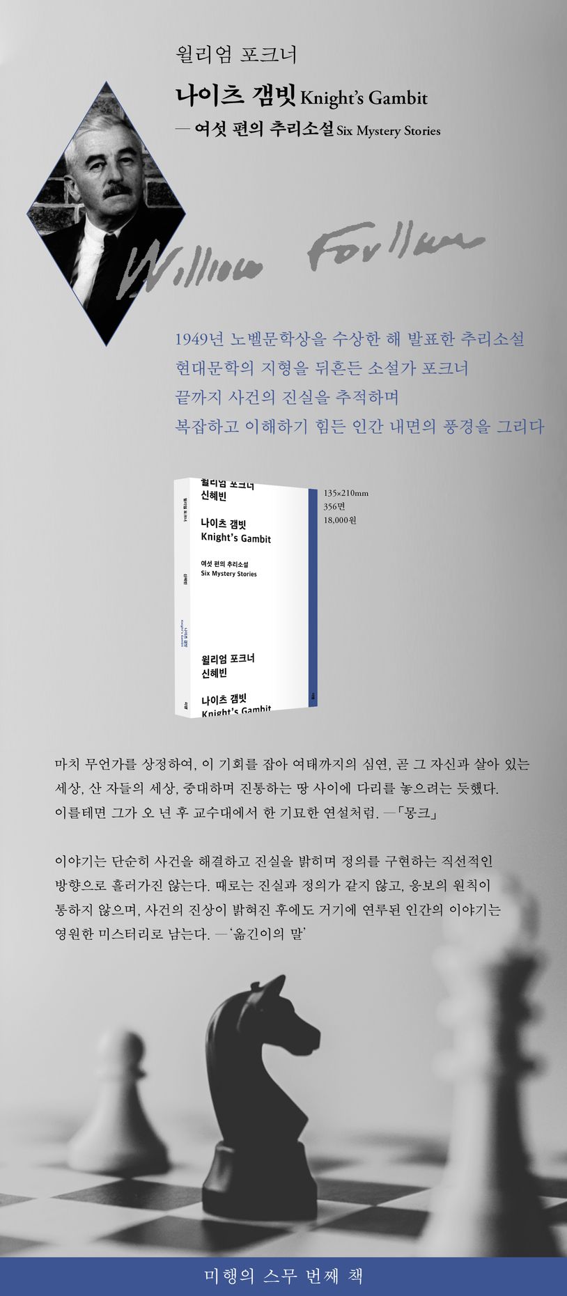 1942년 1월, 포크너는 자신의 출판 에이전트에게 「나이츠 갬빗」이라는 제목의 단편을 보낸다. 잡지사 세 곳에서 모두 거절 의사를 표하자, 포크너는 몇 년 뒤 이를 확장하여 더 긴 중편 길이의 소설로 개작한 뒤 1949년 추리소설집의 표제작으로 발표한다. 이 책 『나이츠 갬빗(Knight’s Gambit)』에 실린 단편들은 1930년과 1940년대 사이 다양한 시기에 쓰여 발표된 작품으로, 포크너가 노벨문학상을 받은 1949년, 랜덤하우스(Random House)에서 이를 모아 출간한다.