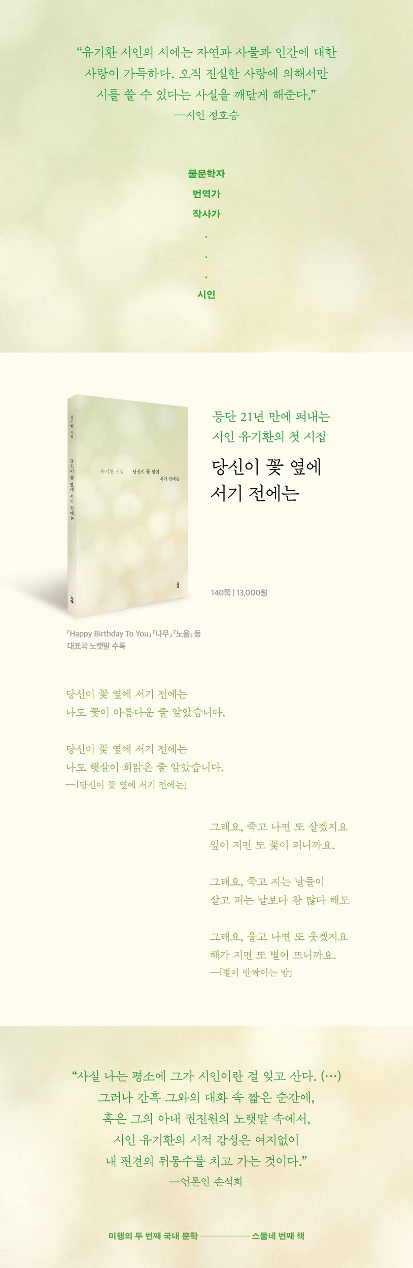 2002년 『문학과의식』으로 등단하고 불문학자, 교육자, 번역가, 작사가로 꾸준히 활동해온 유기환 시인이 등단 21년 만에 첫 시집 『당신이 꽃 옆에 서기 전에는』을 펴낸다. 유기환 시인은 『이방인』, 『목로주점』 등 현대의 고전으로 일컬어지는 여러 프랑스 문학 번역서들과 「나무」, 「Happy Birthday To You」, 「노을」 등 가수 권진원이 불러 대중의 사랑을 받은 곡들의 작사가로 잘 알려져 있다. 특히 대표곡 「Happy Birthday To You」는 레드벨벳의 조이, 배우 구혜선 등이 리메이크했을 만큼 발표한 지 20여 년이 지났음에도 여전히 많은 사랑을 받고 있는 곡이다.