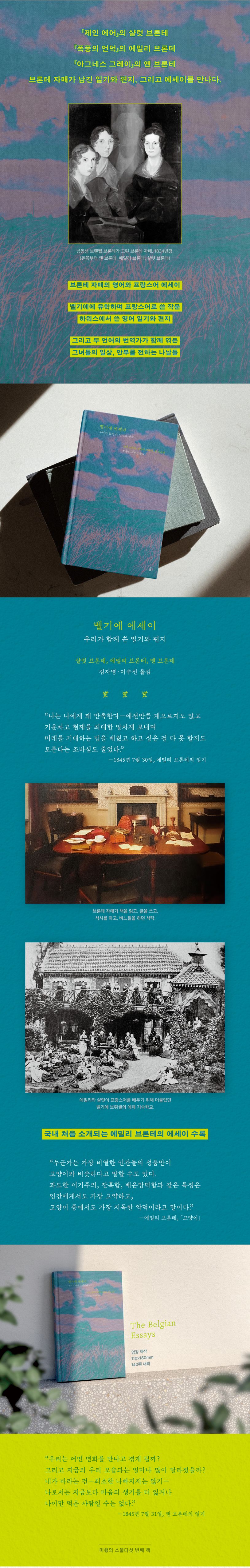 영국 요크셔의 황량하고 거친 들판은 19세기 두 편의 위대한 소설의 배경이었다. 바로 샬럿 브론테의 『제인 에어』(1847)와 에밀리 브론테의 『폭풍의 언덕』(1847)이다. 백 년이 넘은 오늘날까지도 독자들의 마음을 뒤흔들어 놓은 작품들이다. 그들의 막내 여동생인 앤 브론테 역시 『아그네스 그레이』를 쓴 재능 있는 소설가였다. 어머니가 일찍 세상을 뜨고 목사인 아버지와 이모의 손에서 자란 브론테 자매는 일기를 함께 쓰고, 상상의 세계를 공유하며 이야기를 만드는 등 내밀한 관계를 유지했다. 그들이 남긴 일기와 편지, 그리고 샬럿과 에밀리가 벨기에 브뤼셀에서 유학하며 쓴 프랑스어 에세이들을 엮어 『벨기에 에세이』에 담았다.