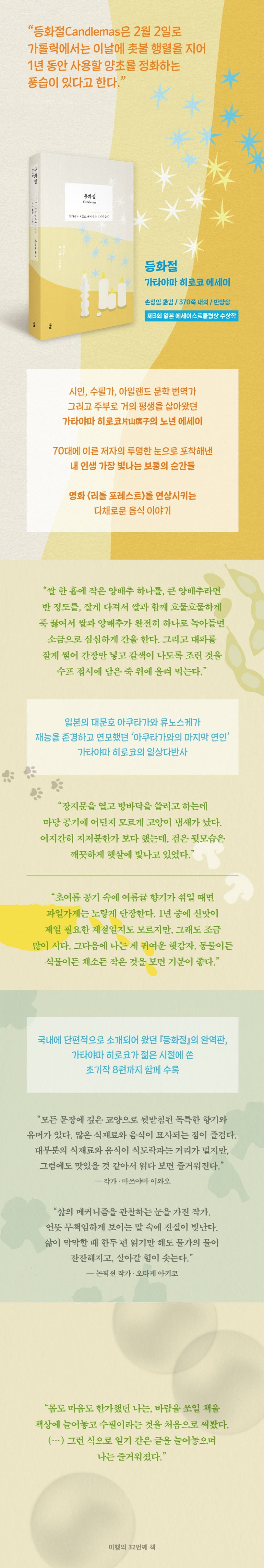 여성이 사회생활을 자유롭게 할 수 없었던 19세기 말 일본에서 태어나 시를 쓰고, 아일랜드 문학을 번역하며 살다가 결혼 뒤 거의 평생을 주부로 살았던 가타야마 히로코(片山廣子, 1878-1957). ‘아쿠타가와의 마지막 연인’이라 불리며 일본의 대문호 아쿠타가와 류노스케가 재능을 존경하고 흠모했던 가타야마 히로코가 70대에 발표한 수필집 『등화절(燈火節)』이 처음 완역되어 소개된다. 1954년 제3회 일본 에세이스트클럽상 수상작인 이 책은 저자의 대표작으로 꼽히며 일본에서 많은 사랑을 받았다. 저자는 일상적인 소재에서 발견한 삶의 이치를 담담한 문장에 담아내며 수필 문학의 진수를 보여주는데, 만년에 이른 작가의 투명한 눈으로 포착해낸 일상 속 보통의 순간들이 한 컷씩 펼쳐진다. 한국어판에는 그동안 단편적으로만 소개되어 왔던 『등화절』 속 모든 수필을 담았을 뿐만 아니라 가타야마 히로코가 젊은 시절에 쓴 초기 수필 8편까지 함께 수록했다.