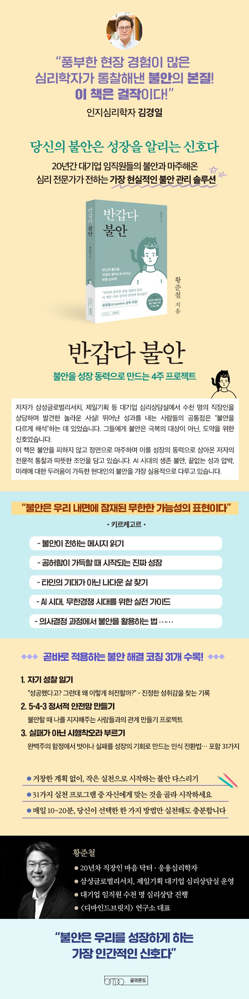 불안은 우리 삶에서 완전히 없앨 수 있는 것이 아니다. 오히려 불안은 우리가 성장하고 있다는 신호이며, 이를 제대로 이해하고 활용할 때 우리는 더 나은 삶을 만들어갈 수 있다. 이 책은 현장에서 직접 검증된 방법들을 바탕으로, 당신이 불안과 함께 살아가면서도 끊임없이 성장할 수 있는 구체적인 길을 안내한다.