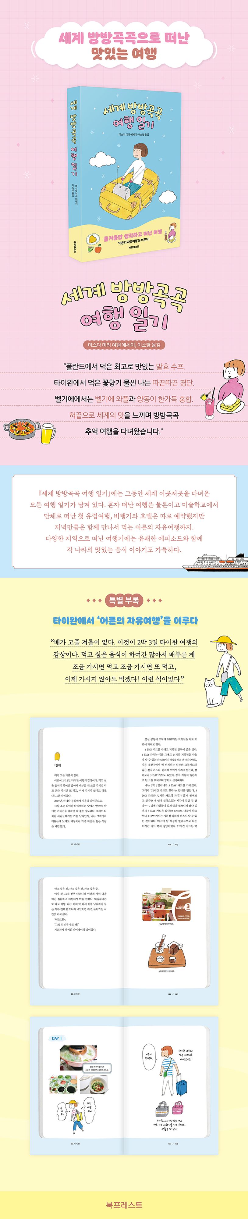 이번 북포레스트에서 출간된 『세계 방방곡곡 여행 일기』에는 그동안 세계 이곳저곳을 다녀온 모든 여행 일기가 담겨 있다. 혼자 떠났던 여행은 물론이고 미술학교에서 단체로 떠난 첫 유럽여행, 비행기와 호텔은 따로지만 저녁만큼은 함께 만나서 먹는 어른의 자유여행까지. 다양한 지역으로 떠난 여행기에는 유쾌한 에피소드와 함께 각 나라의 맛있는 음식 이야기도 가득하다. 혀끝으로 세계의 맛을 느끼며 방방곡곡으로 여행을 떠난 마스다 미리의 일기는 여행에 대한 기대와 설렘을 다시 품게 해주고, 자유롭고 행복했던 여행의 기억을 떠올리고 있을 독자들에게는 사진첩을 보는 듯한 시간을 제공할 것이다.