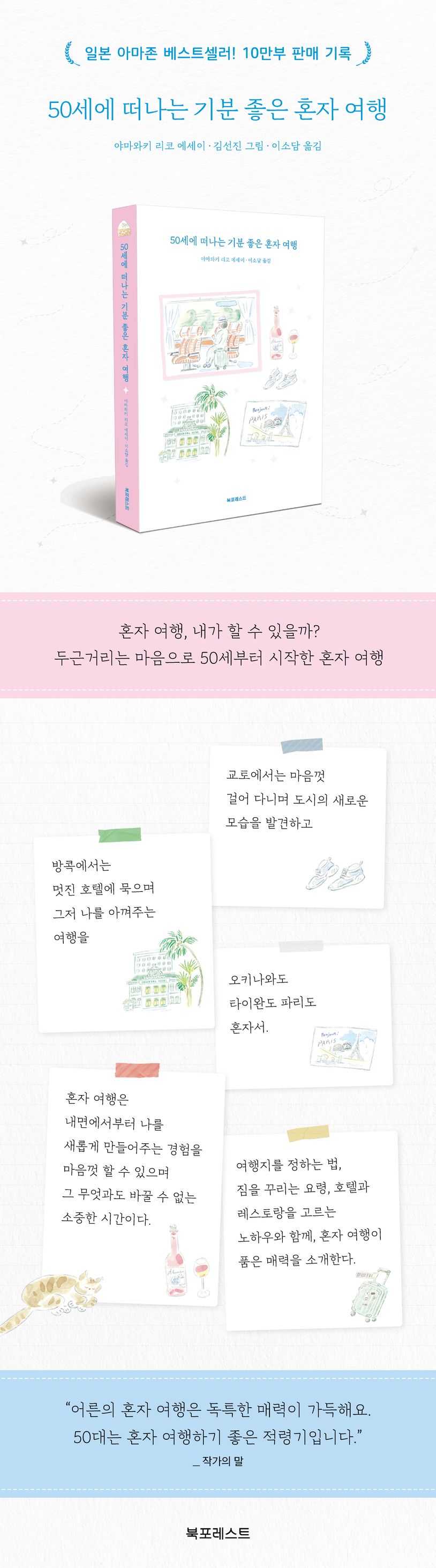 50세, 몸이 좋지 않아서 병원에 갔더니 진단 결과는 노화! 노화라니, 혼자 중얼거리며 곤란한 기분으로 버스 창문에 비친 얼굴을 봤는데 입술은 처졌고 미간에는 알 수 없는 주름이……. 그냥 두면 점점 더 우울해지겠다 싶어서 앞으로는 근사한 경험을 하며 즐겁고 기분 좋게 살기로 결심한다. 건강을 지키면서 좋은 기분을 잔뜩 저금할 수 있는 일이 무엇일까, 고민하며 다양한 시도를 해본 후 얻은 결론은 바로 ‘혼자 여행’이었다.