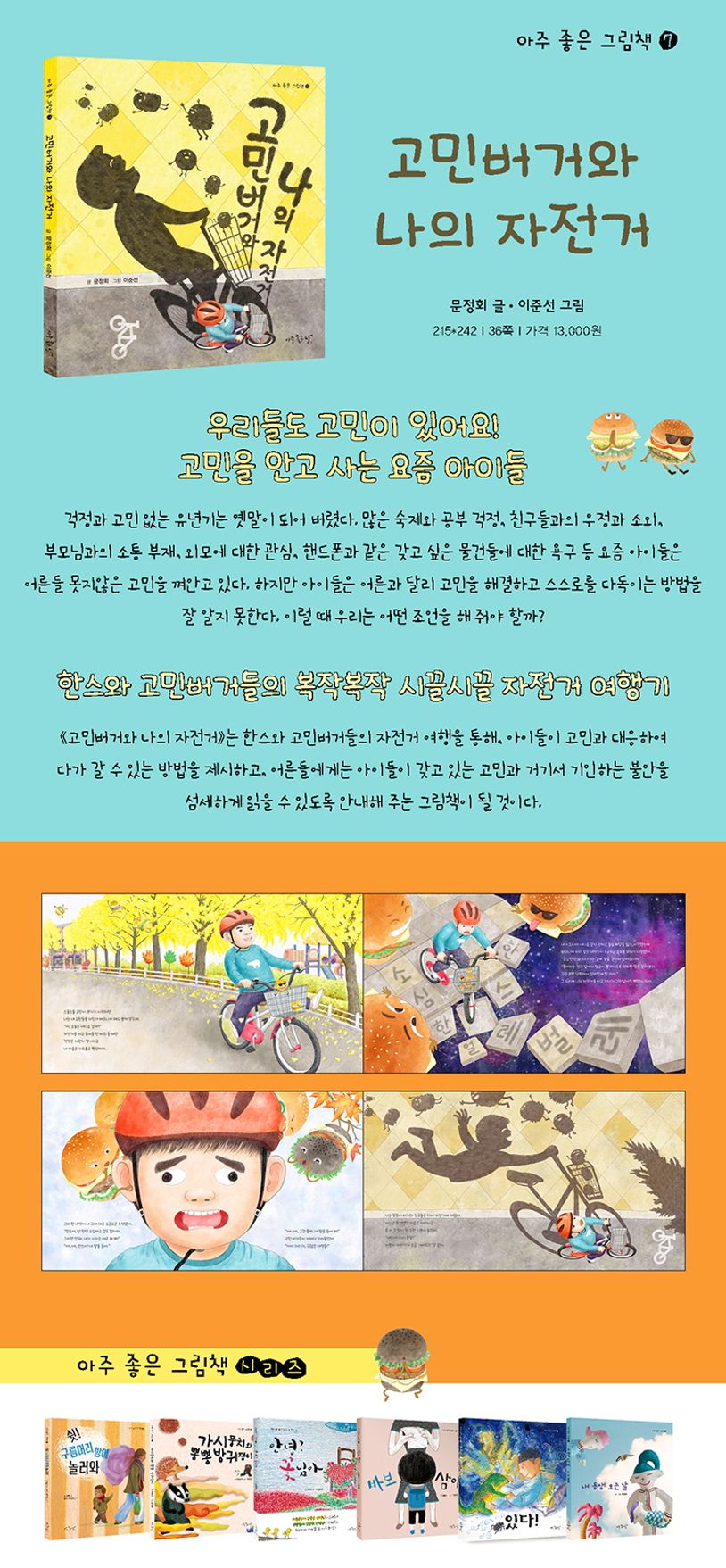 우리들도고민이있어요!고민을안고사는요즘아이들대한민국아이들의삶은행복할까?안타깝게도그답은‘NO’다.대한민국아동ㆍ청소년의행복지수는OECD국가중최하위수준이다.보건복지부에의하면,9~17세아동ㆍ청소년의행복지수는OECD28개국가(평균7.6점)중꼴찌(6.6점)이다.사실꼭통계자료를들지않아도아이들의고충은곁에서실감할수있다.유치원이나학교가끝나자마자학원으로직행하고엎친데덮친격으로코로나팬데믹까지겹쳐마음껏뛰어놀수도없는현실이니말이다.걱정과고민없는유년기는옛말이되어버렸다.많은숙제와공부걱정,친구들과의우정과소외,부모님과의소통부재,외모에대한관심,핸드폰과같은갖고싶은물건들에대한욕구등요즘아이들은어른들못지않은고민을껴안고있다.하지만아이들은어른과달리고민을해결하고스스로를다독이는방법을잘알지못한다.이럴때우리는어떤조언을해줘야할까?《고민버거와나의자전거》는바로그해답을제시하는그림책이다.주인공한스는고민이많아도너무많은아이다.동생이귀찮게해서고민,친구들이놀려서고민,학원가기싫어서고민…….하지만한스는그많은고민에매몰되지않고유쾌한상상으로씩씩하세맞선다.바로지끈지끈한고민들을좋아하는작고귀여운햄버거로변신시킨것이다.인형그림책《누구에게나비밀은있습니다》와《내동생오는날》의작가이자,유튜브채널'더돌스호텔'의크리에이터문정회작가가아이들의고민거리를이준선작가의유쾌하고시원한그림으로힐링을선물한다.책《고민버거와나의자전거》에서작가는고민과불안의시절을지나는아이들에게“그까짓것,햄버거처럼자그마할뿐이야!”며힘찬응원의메시지를전한다.《고민버거와나의자전거》를모두읽었을때쯤엔어린독자들의맘속에도작가의발랄하고희망찬응원이전해질것이다.한스와고민버거들의복작복작시끌시끌자전거여행기햄버거가된고민들은한스가품고있던여러가지고민만큼이나이름도다양하다.뚱뚱이버거,투덜이버거,예민이버거…….작고귀여운햄버거가되었지만고민들은여전히성가시다.고민버거들은자전거바구니안에서한스를놀래키고넘어뜨릴궁리만하는데,재미있게그려진이장면에서아이들이마음속의불안을다루기얼마나어려워하는지를엿볼수있다.청소년기가지나기까지도아이들은매일많은것들을처음겪는다.친구를사귀는일부터새로운지식을배우는일,나날이변하는몸과다채로워지는감정까지.난생처음경험하는난관들앞에아이들은고민하고불안에떨수밖에없는데,어른들은때때로아이들의고민을이해못하거나우물쭈물하는모습에답답해하곤한다.《고민버거와나의자전거》는한스와고민버거들의자전거여행을통해,아이들이고민과대응하여다가갈수있는방법을제시하고,어른들에게는아이들이갖고있는고민과거기서기인하는불안을섬세하게읽을수있도록안내해주는그림책이될것이다.〈아주좋은그림책〉시리즈그일곱번째이야기유튜브채널〈더돌스호텔〉의크리에이터이자독특하고매력넘치는바느질인형들로다양한작업을펼치고있는문정회작가가《고민버거와나의자전거》를선보인다.앞서제주도의생명력넘치는생태캐릭터들과따뜻한가족이야기를담았던인형그림책《내동생오는날》이후1년여만에독자들을찾아왔다.문정회작가특유의개성발랄하고온기가득한이야기로,오랜시간독보적인작품세계를완성한이준선그림작가의섬세한수채화가선사할최고의마음돌봄그림책《고민버거와나의자전거》.한스가고민버거들과티격태격하며마침내는고민또한자신의일부임을받아들이는이이야기는비단아이들뿐아니라고민으로마음앓이하는모든이들에게부드러운위로가되어줄것이다.