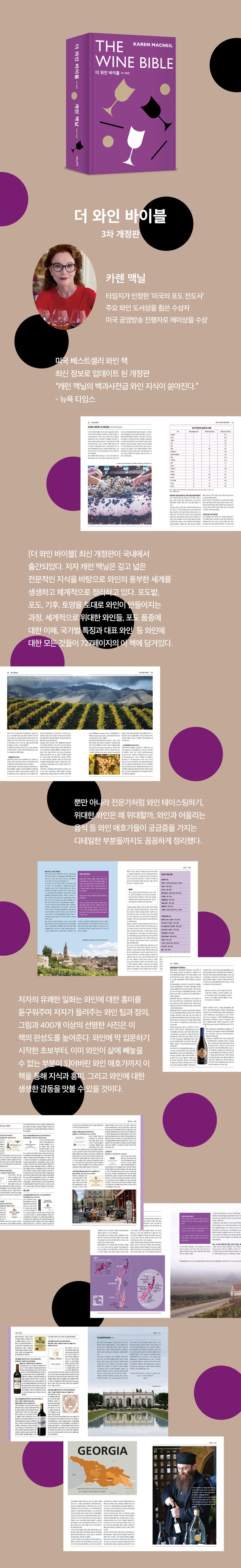 미국 베스트셀러 와인 책, [더 와인 바이블] 최신 개정판이 국내에서 출간되었습니다. 저자 캐런 맥닐은 깊고 넓은 전문적인 지식을 바탕으로 와인의 풍부한 세계를 생생하고 체계적으로 정리하고 있습니다. 포도밭, 포도, 기후, 토양을 토대로 와인이 만들어지는 과정, 세계적으로 위대한 와인들, 포도 품종에 대한 이해, 국가별 특징과 대표 와인 등 와인에 대한 모든 것들이 727페이지의 이 책에 담겨있습니다. 뿐만 아니라 전문가처럼 와인 테이스팅하기, 위대한 와인은 왜 위대할까, 와인과 어울리는 음식 등 와인 애호가들이 궁금증을 가지는 디테일한 부분들까지도 꼼꼼하게 정리했습니다. 저자의 유쾌한 일화는 와인에 대한 흥미를 돋구워주며 와인 팁과 정의, 그림과 400개 이상의 선명한 사진은 이 책의 완성도를 높여줍니다. 와인에 막 입문하기 시작한 초보부터, 와인이 삶에 빼놓을 수 없는 부분이 되어버린 와인 애호가까지 [더 와인 바이블]을 통해 지식과 흥미, 그리고 와인에 대한 생생한 감동을 맛볼 수 있을 것입니다.