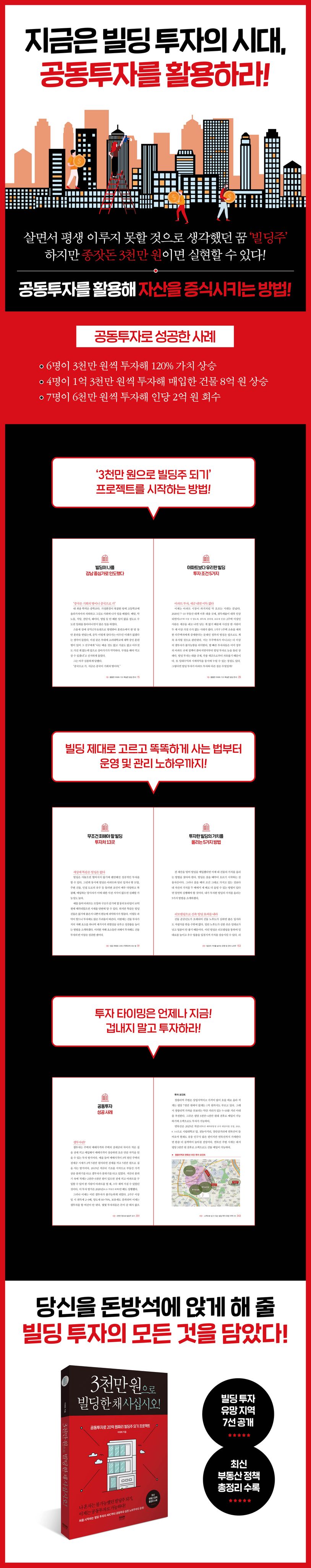 이 책은 빌딩이 성공적인 투자일 수밖에 없는 이유와 좋은 빌딩을 고르는 법, 빌딩주가 되었을 때의 관리 및 운영방법, 임차인과 원만히 계약하고 결별하는 법까지 성공적인 빌딩주가 될 수 있는 노하우를 전부 담아냈다. 혼자서는 살 수 없었던 빌딩, 이제 3천만 원이면 당신도 빌딩주가 될 수 있다! 지금 당장 빌딩 투자에 성공해 플렉스하는 삶을 살아보자!