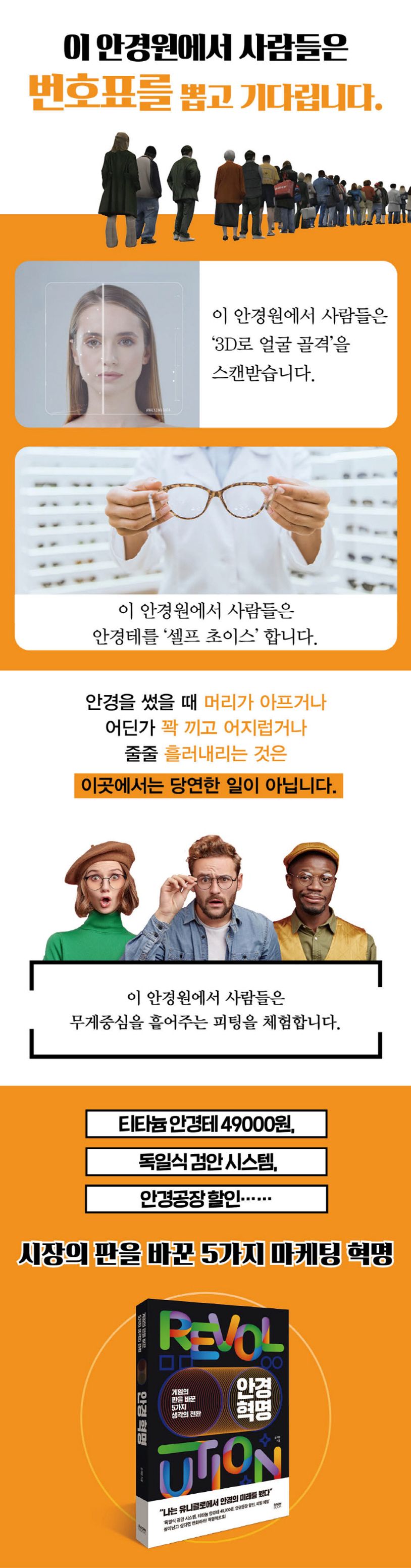 세상이 아무리 바뀌어도 변하지 않는 가치들은 있다. 비즈니스도 결국엔 사람과 사람이 만나서 이루어지는 일이기 때문이다. 《안경 혁명》은 저자가 안경원 매장을 운영하면서 어떻게 한 발 앞서 움직일 수 있었는지, 위기를 기회로 바꿔가는 과정에서 항상 지켜왔던 원칙들이 무엇이었는지 엿볼 수 있다. 다른 업종의 변화를 보면서 힌트를 얻고 ‘나에게는 어떻게 적용할 수 있는가’ 찾아가는 과정은 어려운 시기에도 자신의 사업을 지켜내야 하는 자영업자나 소사장들에게 새로운 용기와 방향성을 제시해줄 수 있을 것이다.