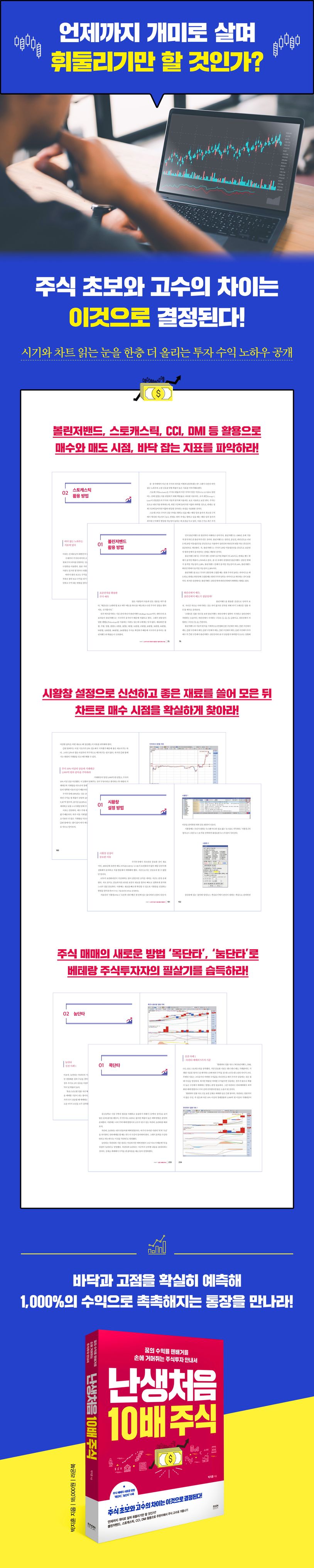 《난생처음 10배 주식》은 그런 이들에게 주식투자의 새로운 시각을 열어준다. 가치투자에만 몰두해 한순간에 손해를 보거나, 명확한 기준 없이 기술적 분석에만 치중해 길을 잃는 일이 없도록 20년이 넘는 시간 동안 쌓아온 투자의 노하우를 풀어낸다. 저자의 강점은 특히 추세매매를 정확히 분석하고 설명하는 데 있다. 그 외에 볼린저밴드, 스토캐스틱, CCI, DMI를 활용해 차트를 정확히 읽고 최고점과 최저점을 읽어내는 방법론도 아낌없이 공개한다. 무엇보다 저자가 만든 비기(?技)인 ‘목단타’, ‘눔단타’ 수법은 주식투자의 길에서 고민하는 많은 투자자에게 가장 확실하게 수익을 낼 수 있는 비책을 알려줄 것이다.