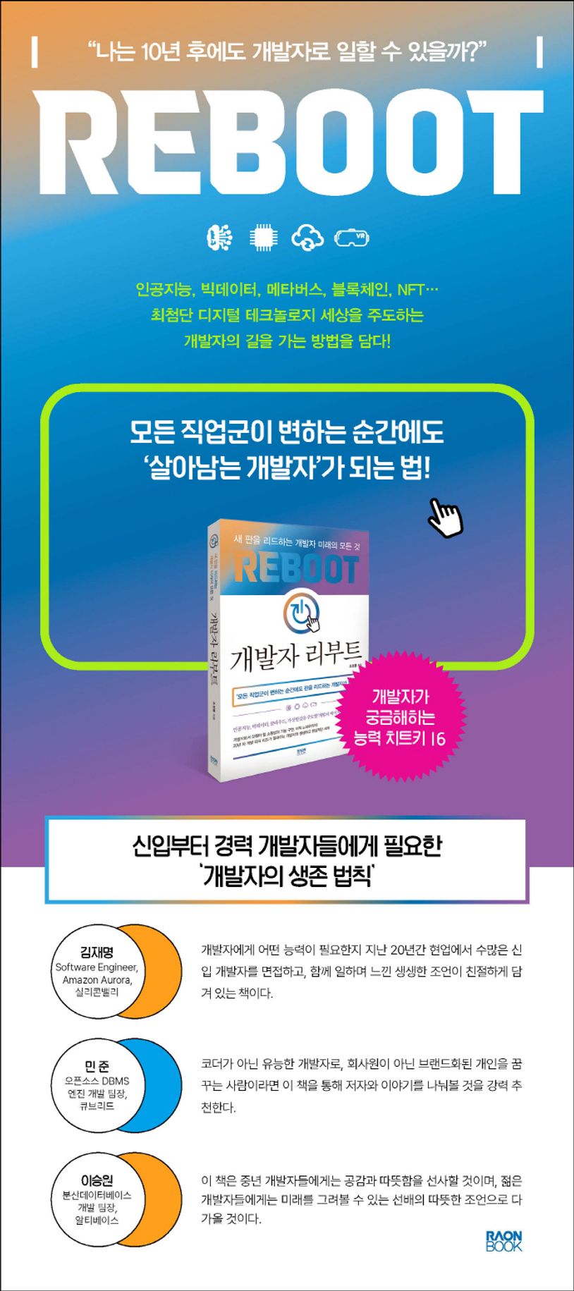 코로나19가 가져온 변화는 분명하다. 재택근무를 시작으로 일상화된 화상회의, 온라인 프레젠테이션, 비대면 배달 서비스 등 언택트 삶에 엄청난 변화가 일어났고, 그에 따른 기술도 가속화되는 중이다. 디지털 혁신 기술은 우리의 삶 전반뿐 아니라 산업의 판도를 새롭게 재구성할 것이다. 그리고 이러한 4차 산업혁명 시대를 주도할 직업은 바로 ‘개발자’가 될 것이다. 그러나 많은 개발자가 이런 변화에 너무 무디다. 여전히 기존의 방식으로 사고하고, 일하고, 패턴대로 행동한다. 시스템 속에서 ‘오더’만을 기한 내에 마감하는 삶의 반복이다. 그렇기에 그 어느 때보다 ‘개발자의 리부트’가 필요한 시대다.