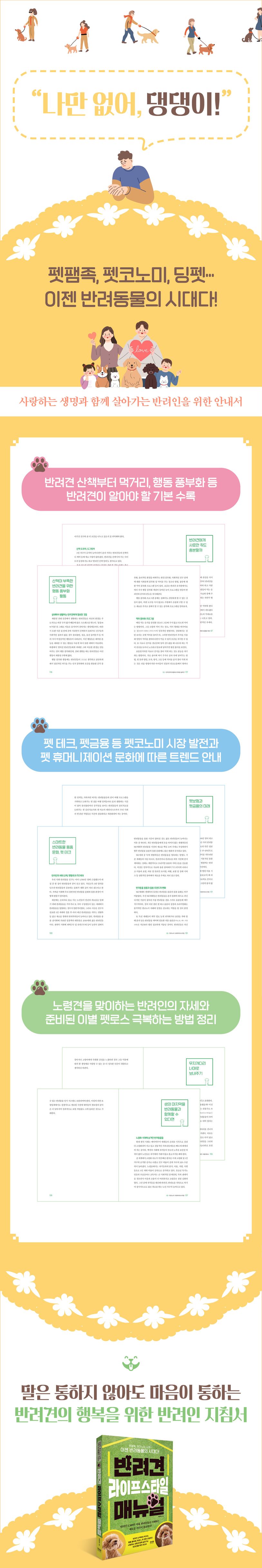이 외에도 반려동물을 가족이라 생각하는 ‘펫팸족’과 펫 테크, 펫금융 등 현재 뜨고 있는 ‘펫코노미(Petconomy)’ 시장, ‘펫 휴머니제이션(Pet Humanization)’에 대해 알기 쉽게 정리해, 펫 관련 비즈니스에 관심 있는 사람들에게도 좋은 아이디어를 준다. 초보 반려인이라면, 반려인을 꿈꾼다면 이 책과 함께 반려견 라이프를 즐겨보자!