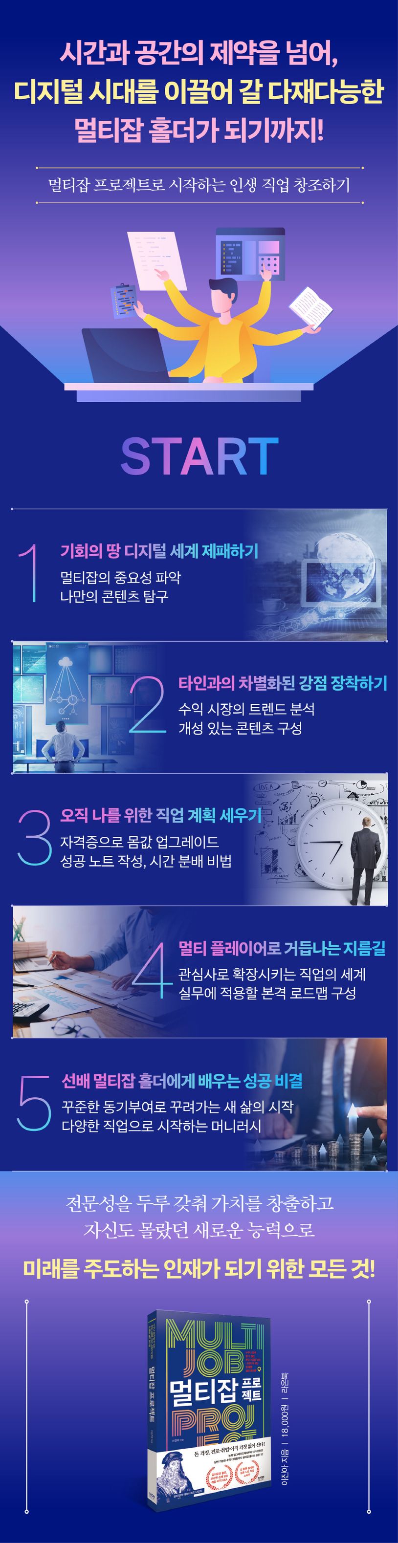 본업 외에 새로운 도전을 하고 싶은데 ‘과연 내가 잘할 수 있을까?’ ‘어렵지는 않을까?’ ‘일만 하면서 살게 되는 건 아닐까?’ 등에 고민을 하고 있다면, 두려워하지 말고 이제는 도전할 때다. 《멀티잡 프로젝트》는 당신도 몰랐던 당신의 새로운 능력과 가치를 찾아줄 것이다.