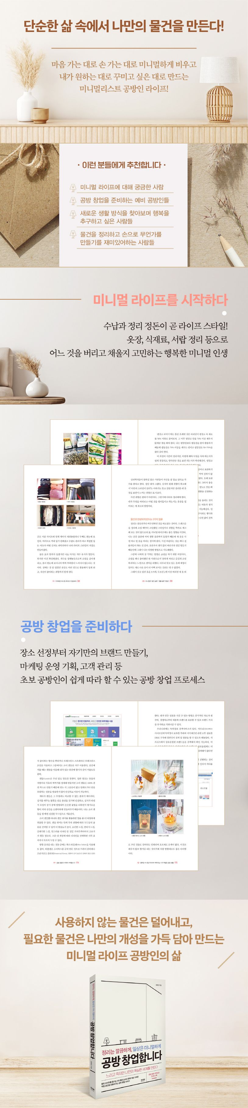 그런데 여기, 이 두 가지의 생활 방식을 동시에 살아가는 것이 참 매력적임을 알려주는 책이 있다. 책 《정리는 깔끔하게, 일상은 미니멀하게 공방 창업합니다》는 사용하지 않는 물건은 덜어내고, 필요한 물건은 나만의 개성을 가득 담아 만드는 미니멀 라이프 공방인의 삶이 담겨 있다. 또한 공방 창업에 관심이 있는 예비 공방인들에게 필요한 프로세스를 소개한다.
