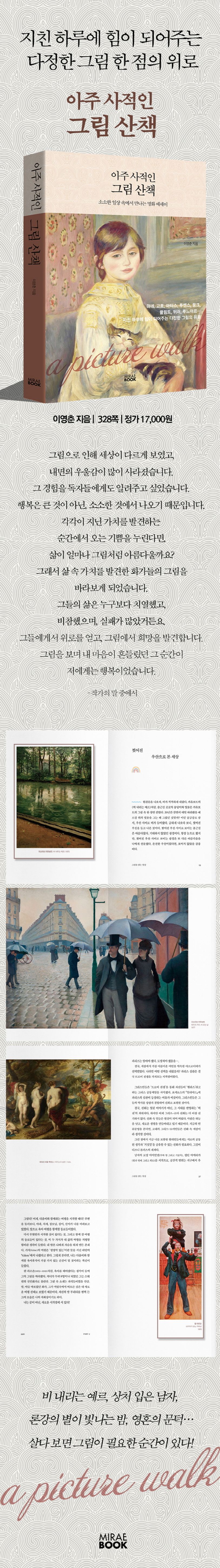 스트레스와 긴장, 걱정으로 하루를 보내고 그림을 보며 마음의 평온을 얻은 저자는 자신처럼 많은 독자들 역시 일상에서 그림의 위로를 얻길 바라는 마음으로 《아주 사적인 그림 산책》을 펴냈다. 지치고 힘들 때에는 백 마디 말보다 다정한 그림 한 점이 더 큰 위로를 건네주기도 한다. 그림 속에 담긴 화가의 개인적인 이야기와 그림이 그려진 비하인드 스토리 등은 덤이다. 일상을 보내면서 그림을 떠올리고 그것을 생활 속에서 연결지은 저자의 이야기를 읽다 보면 편안함과 소소한 행복을 느낄 수 있다.