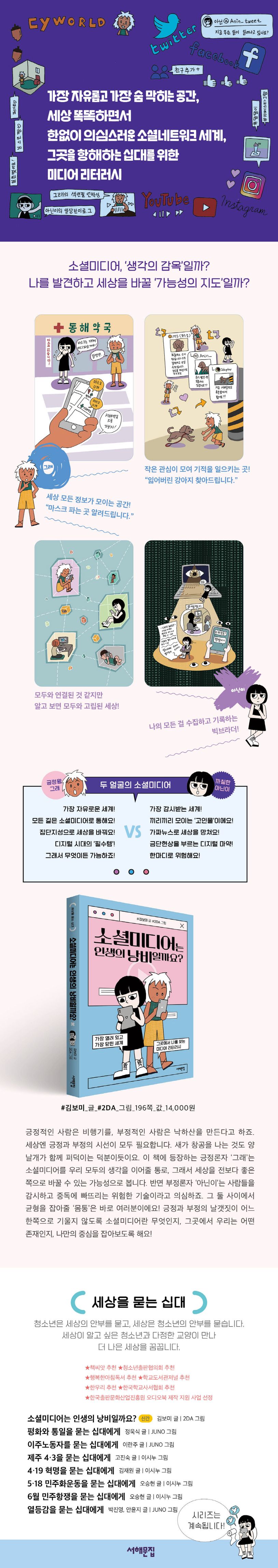어려서부터 인터넷과 스마트 기기에 익숙한 한국의 청소년은 이런 소셜미디어의 장단점을 그 어느 세대보다 예민하게 흡수합니다. 소셜미디어 덕분에 나를 발견하고 세상을 바꿀 수도 있지만, 거꾸로 거기 중독되어 일상이 무너지거나 나쁜 일에 휘말릴 때도 많죠. 이 책은 소셜미디어 문화의 긍정적 측면과 부정적 측면을 맞부딪혀가며 청소년에게 그 세계를 객관적으로 보는 안목을 길러줍니다. 유쾌하고 이로운 소셜미디어 생활을 위한 항해지도인 셈이죠.