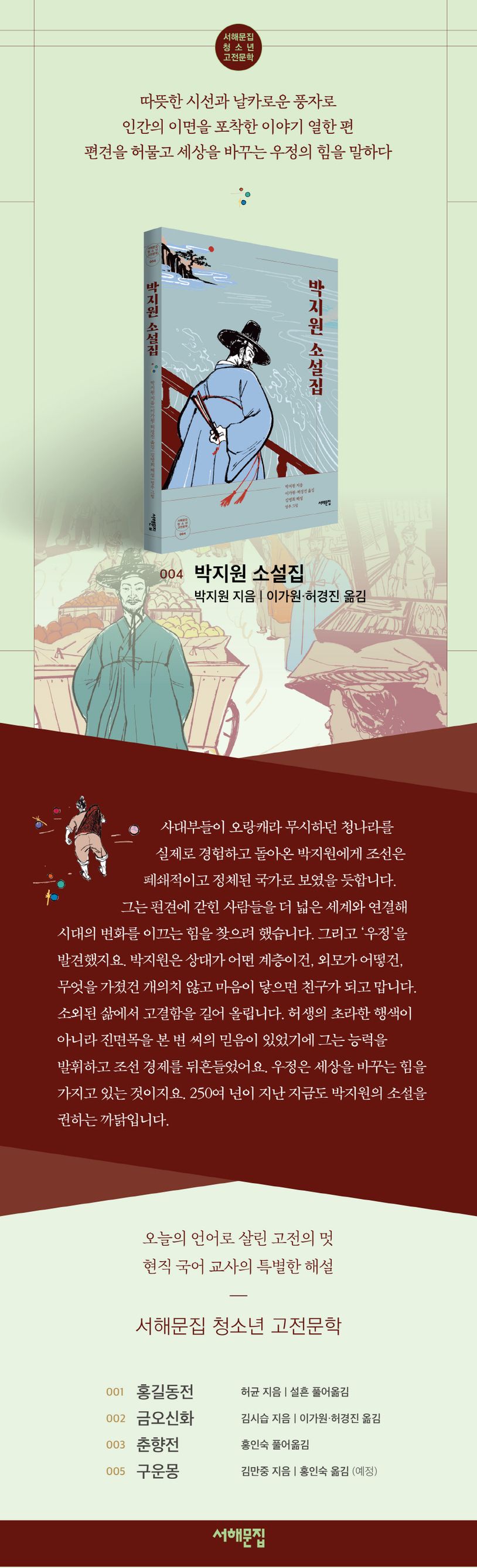 박지원은 조선 사회의 개혁을 막는 신분의 한계와 편견을 허물 방법을 궁리했다. 그리고 ‘우정’을 찾아냈다. 이익과 아첨으로 맺는 관계를 거부하고 상대의 본질을 들여다보는 참된 우정으로 다양한 타자와 소통하기를 촉구했다. 해설은 이러한 소망을 각각의 작품에서 발견해 다층적인 박지원의 소설 세계를 하나의 줄기로 꿰뚫어 읽을 수 있게 돕는다.