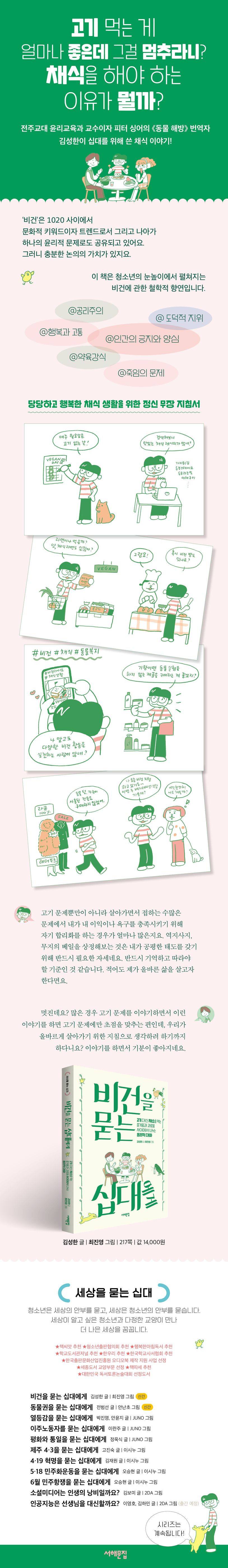 《비건을 묻는 십대에게》는 전주교대 윤리교육과 교수이자 피터 싱어의 〈동물 해방〉 번역자 김성한이 십대를 위해 쓴 채식 이야기이다. 김 교수/동물권 활동가/채식이, 세 인물이 최대 다수의 최대 행복으로 대표되는 공리주의 등을 두고 윤리적 대화를 나눈다. 고기 대신 채소를 먹는 즐거움과 괴로움 사이에서 모두의 행복을 위한 채식 논의가 이제 펼쳐진다.