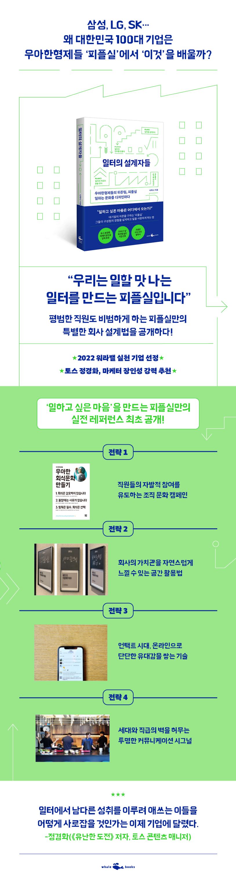 “행복한 구성원이 좋은 서비스를 만든다”는 창업자의 특별한 철학 아래 탄생한 이 이상하고 다정한 조직은 ‘접점’ ‘소통’ ‘제거’ ‘전략’ ‘존중’이라는 다섯 가지 전략을 펼친다. 전사 행사로 직원들을 몰입하게 하는 법부터 밥 한 끼로 유대감을 쌓는 노하우까지, 피플실이 100대 기업들을 자문하며 얻은 생생한 빅데이터가 스토리텔링 형식으로 빼곡히 수록되어 있다. 규모가 작은 회사라도 충분히 실행할 수 있는 작지만 강력한 솔루션 또한 단계별로 마련하고 있어 레퍼런스가 필요한 회사를 위한 입문서로도 탁월하다.