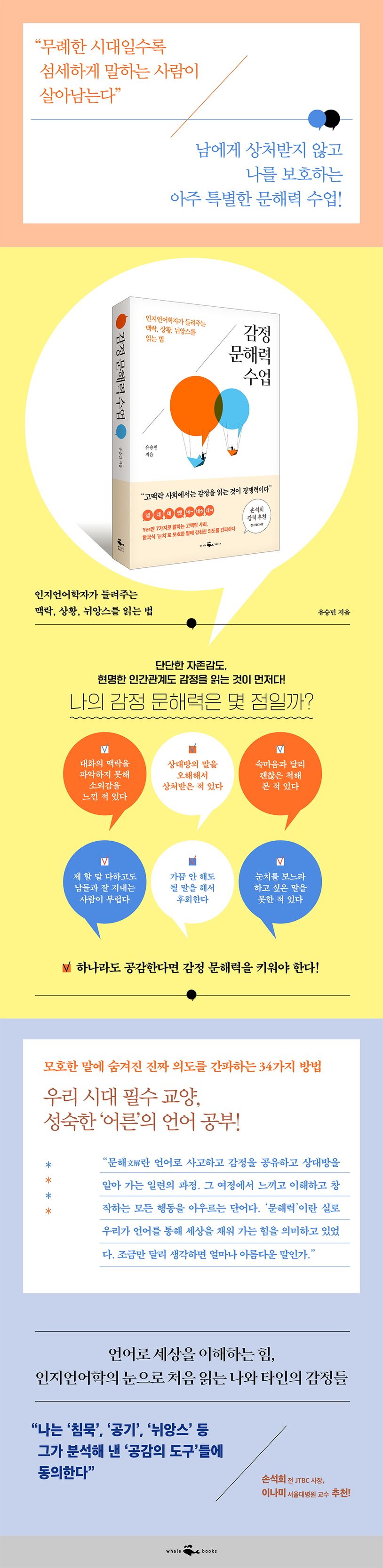 문해력이란 글을 해석하는 힘일 뿐 아니라 말을 적확하게 이해하는 도구다. ‘눈치’ ‘침묵’ ‘반어법’ 같은 말의 기술들을 공부하면 누구나 ‘감정 문해력’을 키울 수 있다. 책을 통해 우리가 무의식적으로 사용하는 이런 도구들의 원리를 알고 올바르게 표현한다면 관계, 소통, 심리 등 다양한 상황에서 겪었던 수많은 문제의 해답을 얻을 수 있다.
