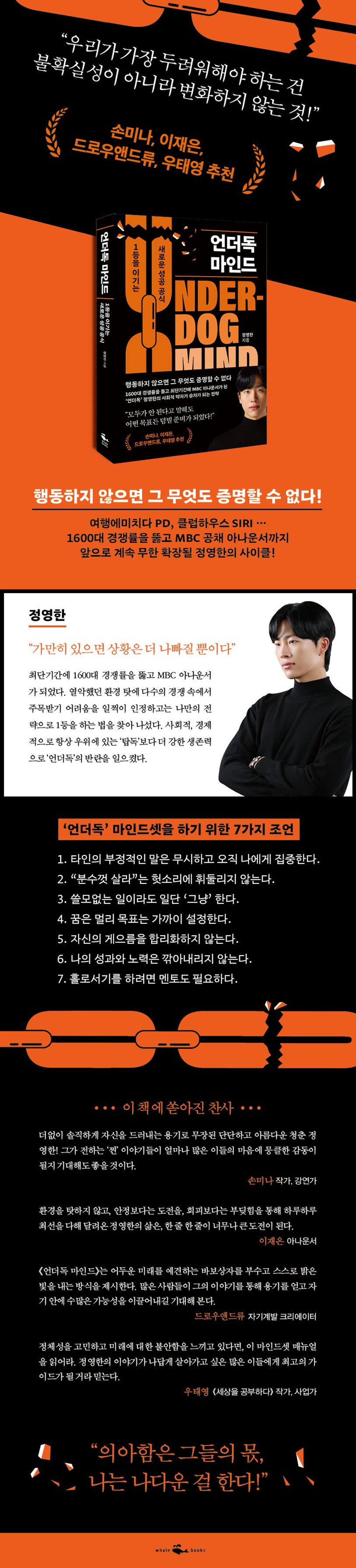 《언더독 마인드》는 조금은 불우한 환경과 경제적 제약이 넘쳐도, 남들이 내 목표에 의아해하더라도 꿈을 이뤄내게 해준 원동력과 동기가 무엇인지 보여준다. 경제적 제약이 넘치는 환경에서도 하고 싶은 걸 할 수 있었던 이유, 모두가 내 목표를 부정하더라도 자기 확신을 가질 수 있었던 이유 등을 담담하고 솔직하게 이야기한다.