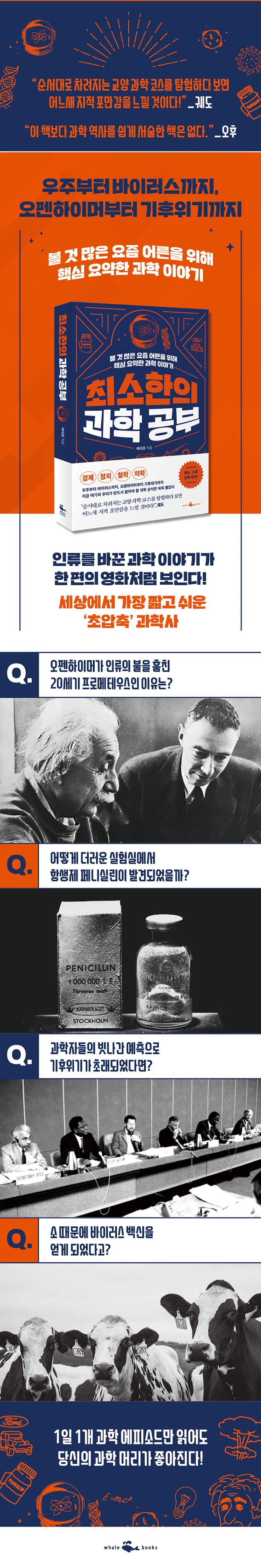한 편의 영화를 보듯 복잡하게 얽힌 과학사를 재미있는 히스토리로 풀어낸 《최소한의 과학 공부》는 과학이 인류의 삶을 어떻게 뒤바꾸었는지를 이야기하며, 핵심 키워드 ‘경제’, ‘정치’, ‘철학’, ‘의학’과 과학의 관계성을 한 번에 압축해 소개한다.