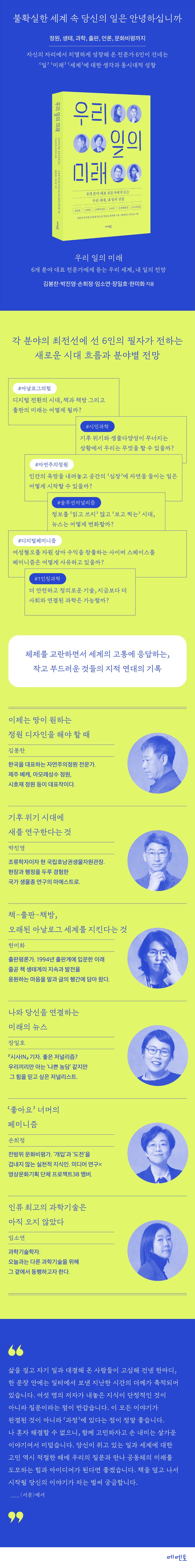 『우리일의미래』를공동기획하고편집한출판하는언니들*은1970년대초반에태어나1990년대중후반부터30년넘게책생태계를지켜온편집자들이다.이들은막연한불안이미래를뒤덮고있는지금,우리가속한세계가향하고있는방향을구체적으로바라볼필요성에깊이공감하면서1년간이프로젝트를준비했다.『우리일의미래』는시대의징후를놓치지않는편집자의시선과오랜업력으로다져온전문가들과의깊은관계를바탕으로,동시대의요청에가장활발히발언하는연사들을초청해우리세계를조망하고불확실한미래를전망한책이다.