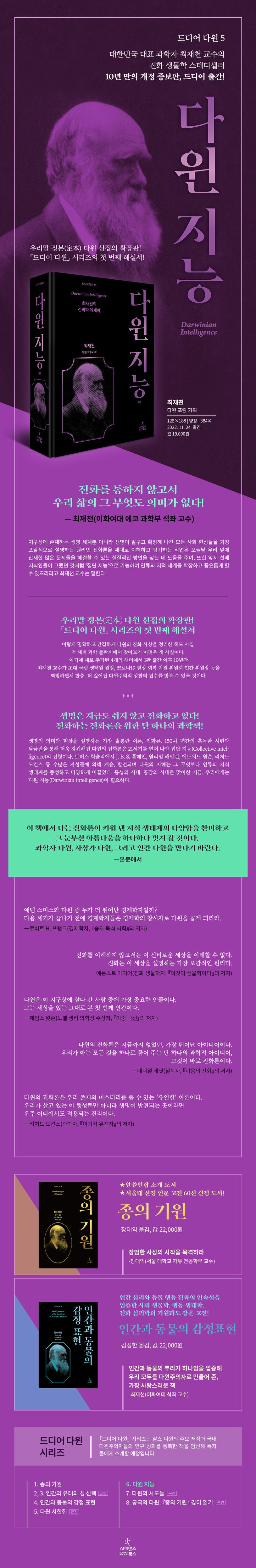 이번에출간된이책『다윈지능』2판은「드디어다윈」시리즈5권으로출간되는데,1판의기존원고의지식과정보를업데이트하고,1판에서다루지못한주제인팬데믹(pandemic)과공진화,마음의진화,음악의진화,그리고호모심비우스(Homosymbious)에관한글을추가한개정증보판이다.최재천교수는『다윈지능』1판에서다윈주의를‘간결미’,‘다윈지능’,‘21세기필수교양’이라는키워드로정리한바있다.‘간결미’라는키워드는다윈의진화론이‘변화를동반한계승’과‘자연선택을통한진화’라는그토록간단한단순한단세포생물이우주의탄생과생명의진화를성찰하는복잡한신경망을갖춘동몰로진화하는것을근본적으로깔끔하게설명하는이론이라는뜻이고,‘다윈지능’이라는키워드는이러한다윈주의적방법론으로무장하면생물학에서출발해서생태학,심리학,사회학,철학,미학등을거쳐물리학에이르기까지인간의지식체계를통섭적으로재구축할수있다는뜻이며,‘21세기필수교양’이라는키워드는이제는전문가만이아니라일반대중까지모든사람이다윈주의적진화론의관점을가지고세상을바라볼필요가있다는뜻이다.이렇게명확하고간결하게다윈의진화사상을정리한책도사실전세계과학출판계에서찾아보기어려운게사실이다.여기에새로추가된4개의챕터에서1판출간이후10년간최재천교수가초대국립생태원원장,코로나19일상회복지원위원회민간위원장등을역임하면서한층더깊어진다윈주의적성찰의진수를맛볼수있을것이다.