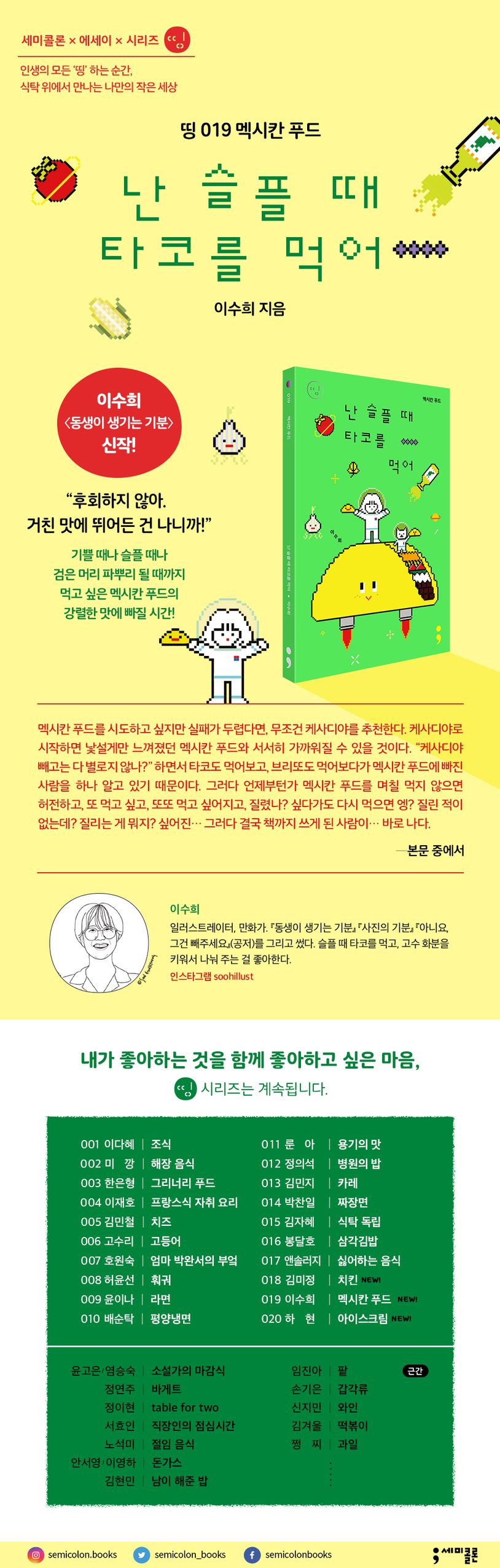 멕시칸 패스트푸드점과 멕시칸 펍 아르바이트생으로 시작해, 주식으로 타코를 만들어 먹는 자취생을 거쳐, 결국 나 홀로 멕시코 식도락 여행까지 떠난, 누구보다 멕시칸 푸드에 진심인 사람의 멕시칸 푸드를 향한 연서가 시작된다.