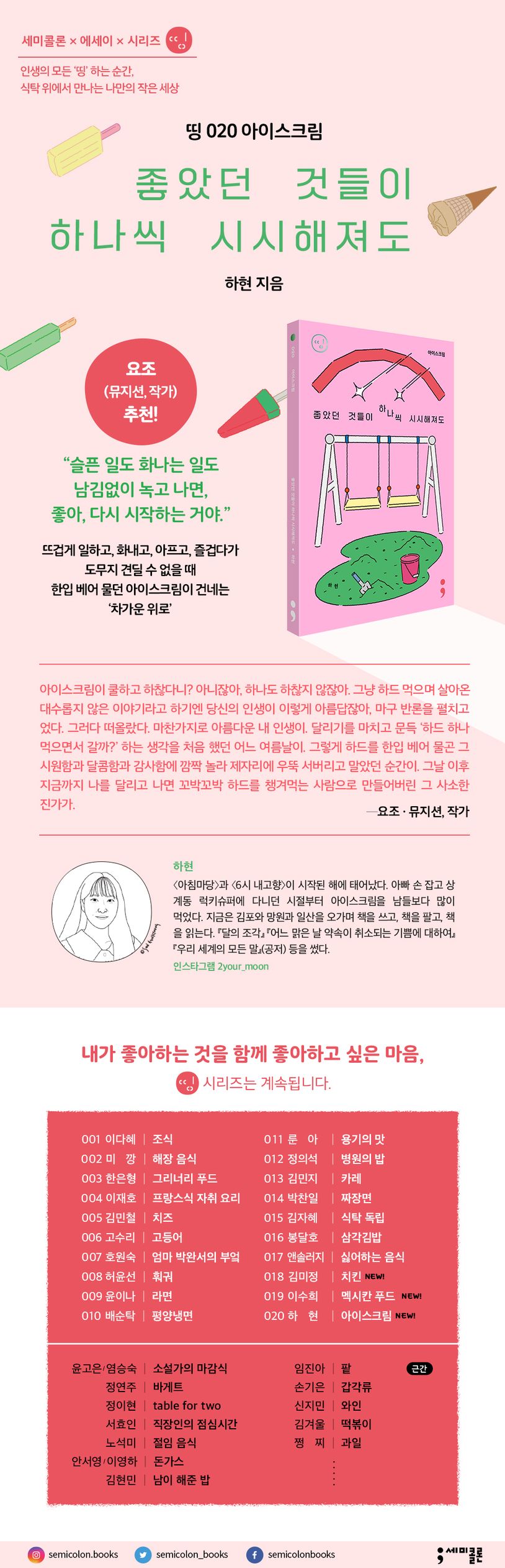 오랜 시간 동안 꾸준한 사랑을 받고 있는 베스트셀러 『달의 조각』 이후 따스하고도 섬세한 글로 왕성한 집필 활동을 이어온 하현 작가의 신작 『좋았던 것들이 하나씩 시시해져도』가 출간되었다. 늘 세상에 대한 다정한 관심으로 주변에서 일어나는 일을 섬세하게 관찰하면서 자신의 내면에서 들려오는 목소리에도 귀 기울일 줄 아는 작가. 에세이 작가로서의 천부적인 능력을 가진 그의 이번 화두는 띵 시리즈의 스무 번째 주제 ‘아이스크림’이다.