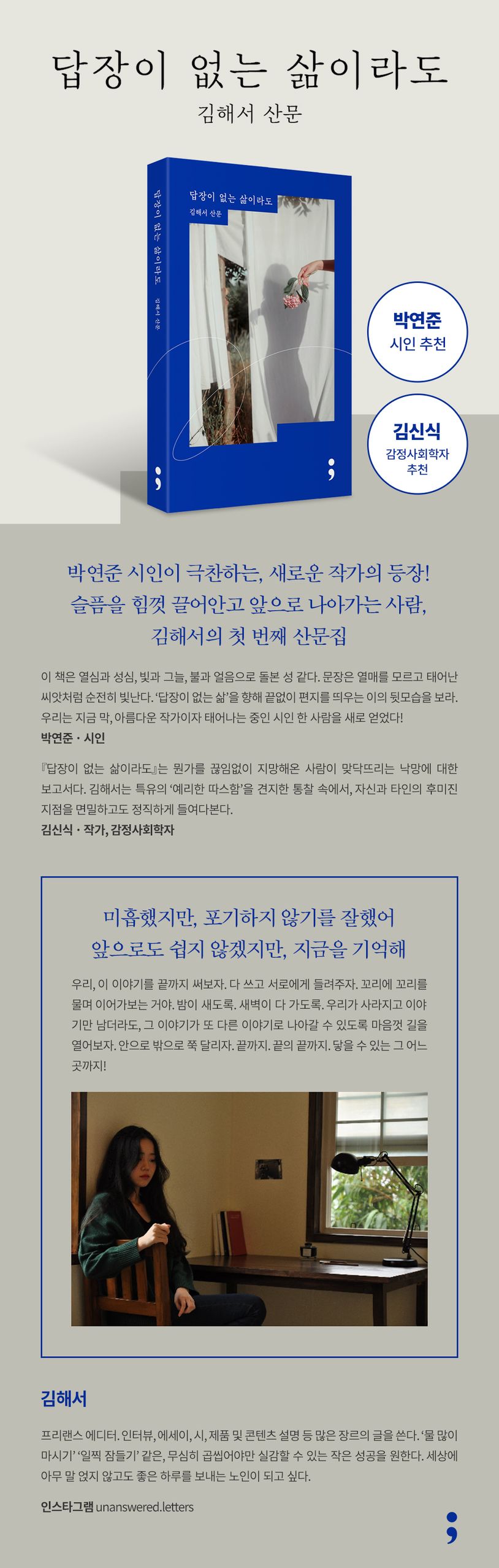 김해서의 첫 번째 산문집 『답장이 없는 삶이라도』. 이 책은 총 세 가지 파트로 나누어져 있다. 먼저 첫 번째 파트 〈시와 슬픔 사이〉는 김해서의 인생에서 시가 어떻게 시작됐고, 어떻게 이어졌다 멈췄으며, 누구를 만나 다시 쓰이게 되었는지에 대한 이야기로 채워진다. 이 과정을 통해 우리는 김해서라는 개인의 인생을 이해하는 단서를 획득하게 되기도 하고, 그가 더 넓은 세계로 나아가는 글쓰기의 단초가 되는 정서를 품고 있다는 점에서 주목할 만하다. 직업적으로나 개인적으로나 꾸준히 ‘쓰는 감각’을 예민하게 키우고 끊임없이 스스로에게 말을 거는 과정이다. 두 번째 파트 〈슬픔과 나 사이〉에서는 작가가 천착하는 감정인 ‘슬픔’에 대해 이야기하고 있다. 등단에 자꾸 실패하고, 사랑하는 동생이 병을 이겨내지 못하고, 위축되고 상처투성이었던 유년 시절의 기억이 여전히 아프고, 일마저 내 마음대로 되지 않는다. 삶의 순간마다 켜켜이 쌓여온 슬픔이라는 정서가 작가를 어떻게 성장시켜왔는지, 깊은 바다처럼 슬프고 벅찬 삶 속에서 조약돌처럼 작고 뭉툭한 기쁨들을 어떻게 발견하고 수집해왔는지에 대해 말하고 있다. 슬픔으로부터 발생한 고독, 지겨움, 기쁨, 희망, 사랑 그 모든 것들이 ‘슬픔과 나 사이’에 존재한다. 세 번째 파트 〈나와 당신 사이〉에서는 시선을 나에서 주변으로 확장시켜 작가 자신을 둘러싼 관계를 살피고 있다. 연인, 가족, 친구, 일터와 일상에서 마주치는 사람들과의 관계 속에서 생겨난 마음들을 특유의 섬세한 통찰력으로 기록한다. 단란했지만 어쩔 수 없이 서로에게 상처를 주고 많은 것을 감내해왔던 가족 사이에 쌓여온 감정의 앙금을 스스로 해소해나가는 과정도 여기에 포함된다.