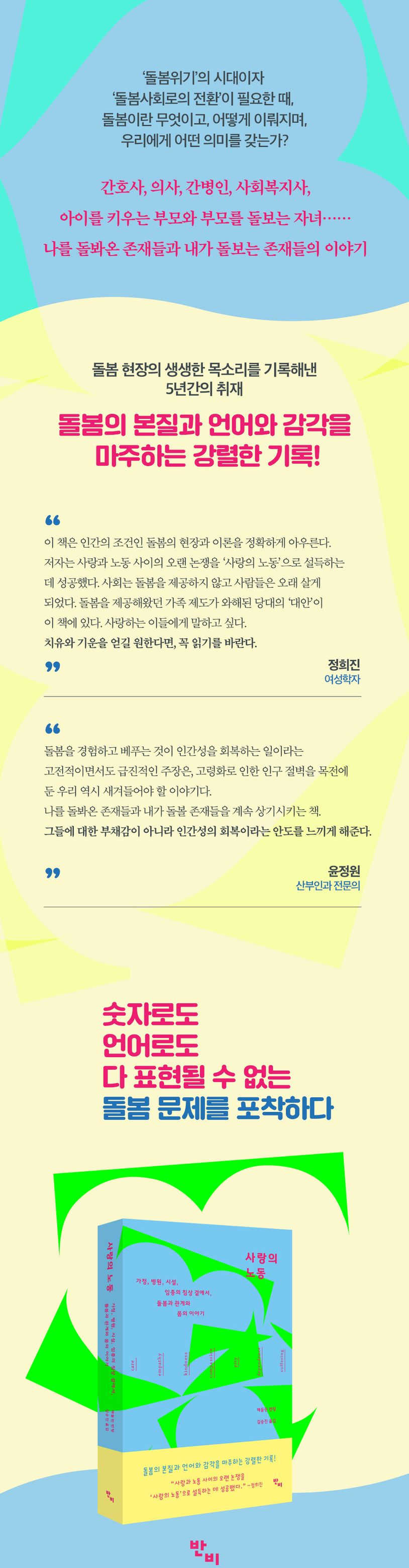 이 책은 인간의 조건인 돌봄의 현장과 이론을 정확하게 아우른다. 저자는 사랑과 노동 사이의 오랜 논쟁을 ‘사랑의 노동’으로 설득하는 데 성공했다.-정희진(여성학자)