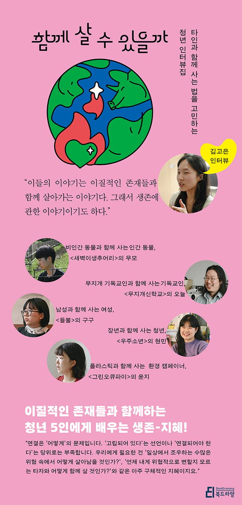 여기, ‘이질적인 존재’들을 회피하거나 부정하지 않고 함께 사는 방법을 성실하게 모색하며 깊이 고민해 가는 다섯 청년이 있다. 모두의 해방을 위한 국내 1호 생추어리 〈새벽이생추어리〉의 활동가 무모, 새로운 신학 생태계를 만드는 〈무지개신학교〉의 오늘, 여성 독서 커뮤니티 〈들불〉의 구구, 마을책방 〈우주소년〉의 현민, 주변을 초록으로 점거할 방법을 찾는 〈그린오큐파이〉의 윤지가 그들이다.