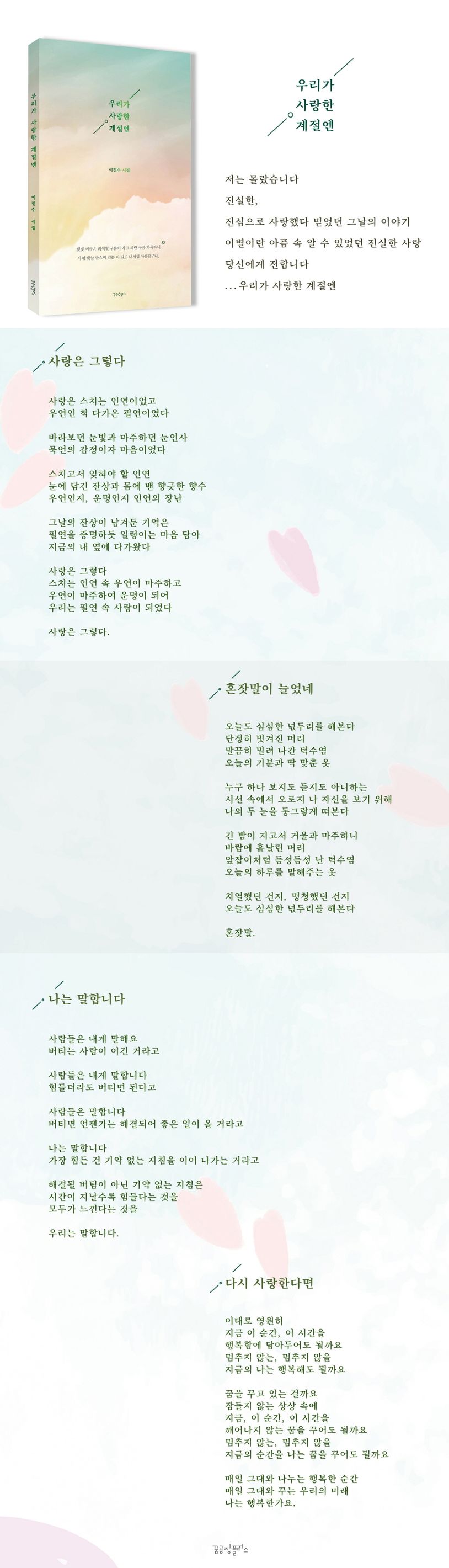 〈우리가 사랑한 계절엔〉 시집 안에는 끝내 하지 못한 말들과 비로소 알게 된 사랑에 대한 감정을 담아낸 사랑의 이야기를 적어 보았습니다.