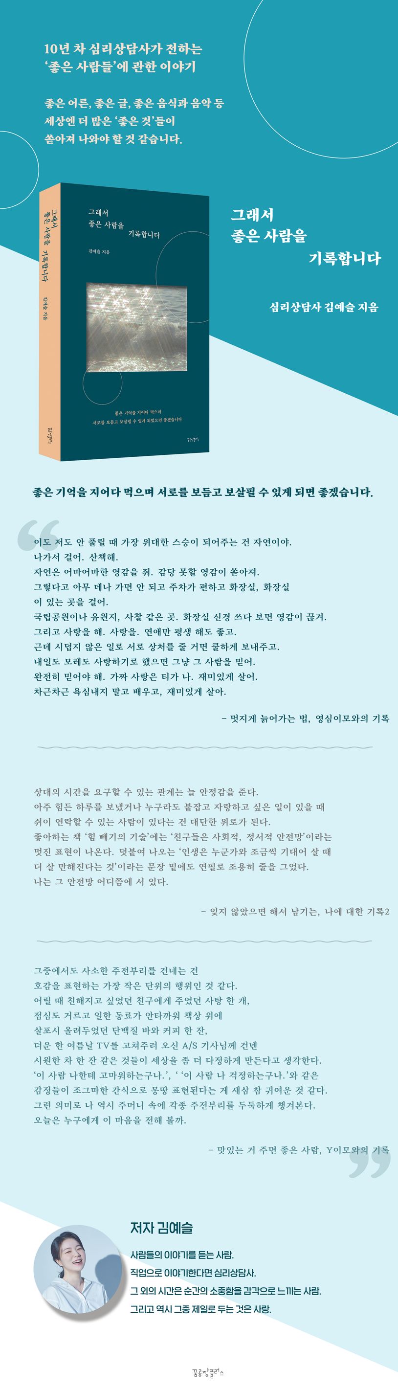 심리상담사로 일한 지 어언 10년. 내담자들을 만나며 자주 안타까웠던 건 이들의 옆에 좋은 어른, 좋은 친구, 좋은 롤모델이 한 명이라도 있었다면 이렇게까지 절망스러워하진 않았을 텐데 하는 아쉬움이다. 나 또한 결코 혼자 크지 않았다. ‘한 아이를 키우려면 온 마을이 필요하다’라는 아프리카 속담처럼 실로 어마어마하게 많은 사람이 나를 키웠다. 하여 나를 성장시킨 좋은 어른, 좋은 친구, 좋은 롤모델들에 관해 기록했다. 이 책이 누군가에겐 좋은 사람의 자리를 대신하거나 누군가에게 좋은 사람이 되어주고 싶다는 마음으로 남아도 좋겠다.