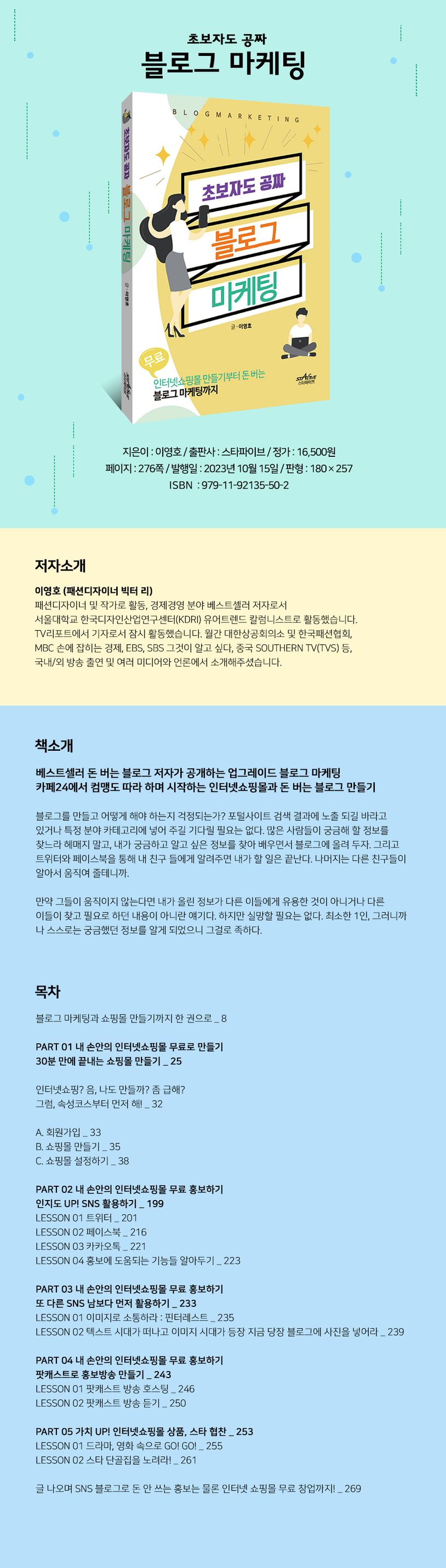 블로그마케팅과쇼핑몰만들기까지한권으로PART01내손안의인터넷쇼핑몰무료로만들기30분만에끝내는쇼핑몰만들기PART02내손안의인터넷쇼핑몰무료홍보하기인지도UP!SNS활용하기PART03내손안의인터넷쇼핑몰무료홍보하기또다른SNS남보다먼저활용하기PART04내손안의인터넷쇼핑몰무료홍보하기팟캐스트로홍보방송만들기PART05가치UP!인터넷쇼핑몰상품,스타협찬글나오며SNS블로그로돈안쓰는홍보는물론인터넷쇼핑몰무료창업까지!