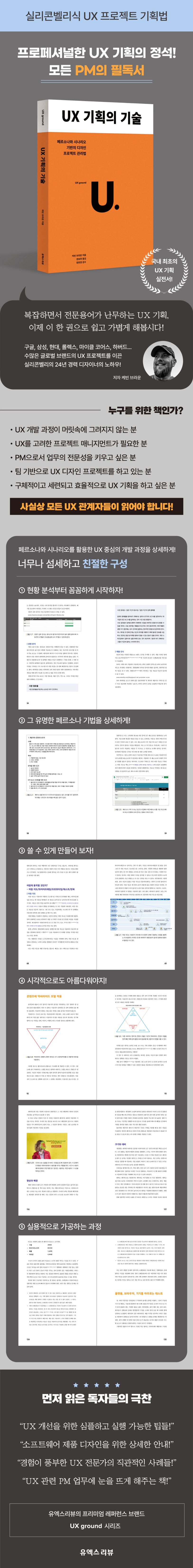 사용자에게 사랑받는 제품/서비스를 만들기 위해서는 제품 개발의 모든 단계에서 사용자 경험을 고려해야 한다. 제품 기획자는 물론이고 프로젝트 매니저, 리서치 담당자, UX 디자이너, 개발자 모두가 UX 기획에 대해 잘 알고 있어야 성공적인 제품이 탄생할 확률도 높아진다. UX 디자인과 프로젝트 매니지먼트는 한 개인 혹은 하나의 팀이 아닌, 프로젝트와 관련된 다양한 팀이 같은 목표를 공유하며 유기적으로 협업해야 하는 팀 스포츠와 같기 때문이다. 기획자와 리서치 담당자는 만들려는 제품이 사용자에게 쓸모 있을지 검토하고, 디자이너는 브랜드를 잘 나타내면서도 사용자가 효율적으로 작업을 완료하도록 아름다운 솔루션을 디자인하며, 개발자는 사용자 경험의 접근성과 성능을 극대화하는 방향으로 코딩하도록 이 책이 안내서가 되어줄 것이다.