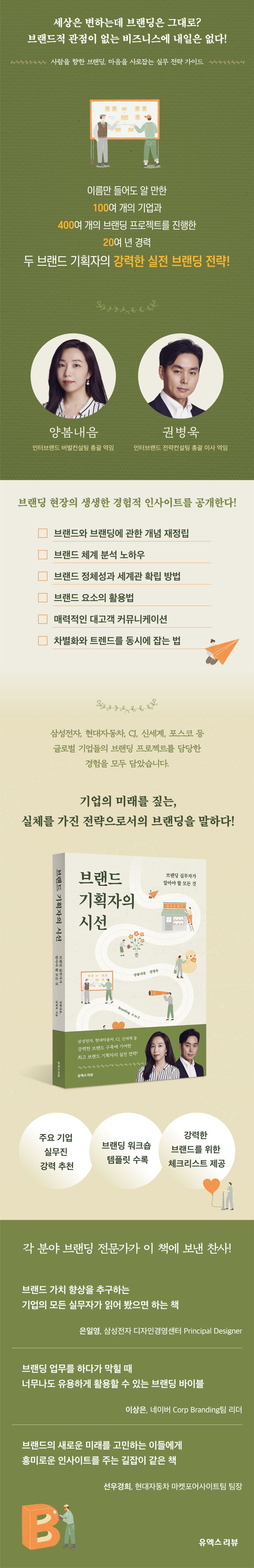 20여 년간 브랜드만을 생각하며 유명 기업들의 프로젝트를 담당해 온 두 브랜드 기획자, 양봄내음과 권병욱은 비즈니스의 전 과정에서 ‘브랜드적 관점’이 필요하다는 점을 무엇보다도 강조한다. 따라서 이 책은 독자들이 비즈니스의 중심이 되어야 할 브랜드관을 탄탄히 세울 수 있도록 브랜딩의 과정을 그 어떤 브랜딩 도서보다 쉽고 친절하게 안내하고 있다. 브랜드 체계의 파악과 브랜드 가치의 구성, 브랜드 내재화 프로세스 등 실무에 꼭 필요한 브랜딩의 과정을 다양한 사례와 워크숍, 액티비티의 형태로 세밀하게 담고 있어, 미래를 향한 브랜딩 전략을 설계하는 데에 큰 도움이 되어 줄 것이다. 브랜드 기획·홍보·마케팅으로 고민하는 이들을 포함해 각 기업의 CEO부터 주니어까지, 브랜드에 관여하고 있는 이들이라면 누구나 이 책을 통해서 확실한 미래전략이 될 오늘날의 브랜딩에 대해 핵심적인 인사이트를 얻어갈 수 있으리라 확신한다. 저자들은 “브랜딩이 소름 끼치는 한 줄의 콘셉트가 아닌 기업의 미래를 짚는 전략이어야 한다”고 말한다.