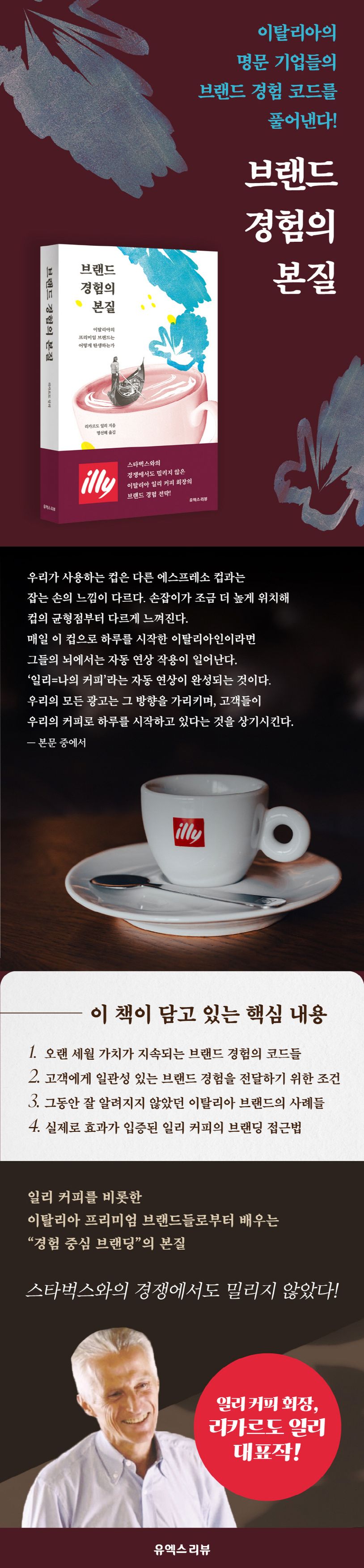 소비자에게 사랑받는 브랜드에는 오랫동안 축적된 경험의 힘이 있다. 고민 없이 만들어진 물건은 고민 없이 버려질 수 있지만, 경험이 담긴 물건은 쉽게 사라지지 않는다. 코로나19로 세계가 어지러운 이 시국에도 브랜드 파워를 굳건히 이어나가는 기업들이 있다. 그 기업들에는 어떤 특별함이 있을까? 이 책은 세계적인 커피 브랜드 일리의 회장이 오랜 경험에서 발견한 이탈리아 명문 기업들의 브랜드 경험 유지 전략과 브랜드 성장 전략에 대해 다룬다. 오랜 세월 명품 브랜드의 지위를 지켜 온 프리미엄 브랜드들의 사례를 통해 빠르게 변하는 세상에 발맞춰 나가면서 무엇을 지키고, 무엇을 변화시킬지 그 기준을 배울 수 있다.