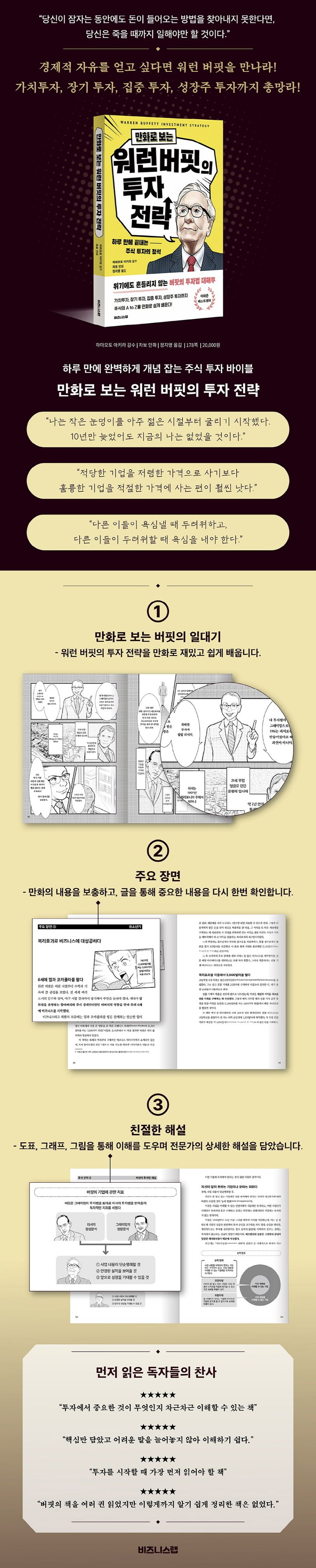 주식 입문자부터 성공한 투자자까지 모두가 추종하는 투자의 대가 워런 버핏. 그의 투자 전략을 담은 최초의 만화책이 출간되었다. 버핏은 위대한 투자가 그레이엄과 필립 피셔의 투자법을 받아들여 투자 대상 기업을 선정하는 독자적 지표를 만들었으며 버크셔 해서웨이를 운영하는 데 이를 활용해 경이로운 성과를 냈다. 지금까지 그의 생애나 투자법을 조명한 책들이 많았지만, 전문 용어와 방대한 분량으로 한 권을 제대로 독파하기란 쉽지 않았다. 《만화로 보는 워런 버핏의 투자 전략》은 버핏의 투자 일대기를 만화로 구성하고, 여기에 전문가의 상세한 해설을 더했다. 흥미진진한 스토리를 따라가다 보면 어느새 가치투자, 장기 투자, 집중 투자 등 버핏이 성공하는 데 토대가 된 투자 원칙의 핵심을 터득할 수 있다. 이 책은 ‘하루 만에 끝내는 주식 투자의 정석’이라는 부제에 알맞게 독자들이 가장 쉽고 빠르게 그의 투자법을 익히고 실전에 적용할 수 있도록 안내한다.
