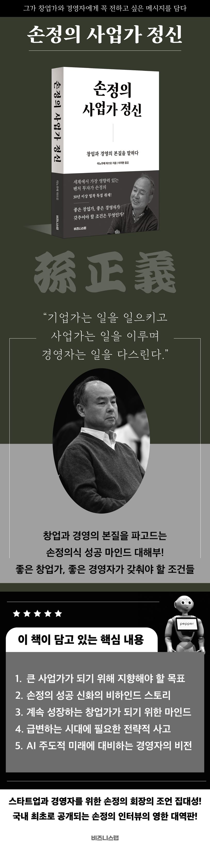 30여 년에 걸친 취재를 통해 세계적인 기업가이자 투자자, 일본 최고 부자인 손정의가 밟아온 창업가, 경영자로서의 삶을 조명한다. 손정의는 “기업가는 일을 일으키고 사업가는 일을 이룬다. 그리고 경영자는 일을 다스린다”고 강조하며, 각자에게 필요한 역할론을 제시한다. 세계화에 주목하며, 나아가 창업을 꿈꾸는 젊은이들, 기업가를 넘어 사업가를 꿈꾸는 사람들이라면 이 책을 통해 비즈니스의 중장기적 방향성을 찾을 수 있을 것이다.
