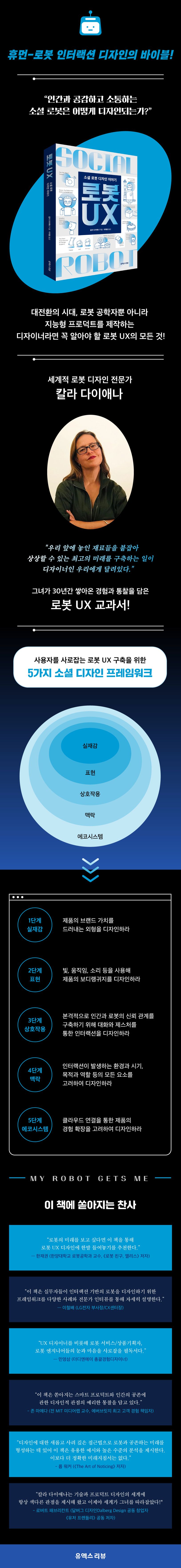 《로봇 UX》는 스마트 프로덕트를 디자인함에 있어 1세대의 단순한 기능을 넘어서서 더 높은 사회적 역할을 하는 단계로 도약하는 방법을 제시한다. 저자 칼라 다이애나는 의료 로봇 분야를 선도하는 딜리전트 로보틱스 기업의 책임 디자이너이자 저명한 로봇 UX 연구자로서 디자인 융합의 오랜 연구 분야 중 하나인 '소셜 인터랙션(사회적 상호작용)'을 향후 로봇 분야가 가장 주목해야 할 주요한 개념으로 소개한다. ‘실재감, 표현, 상호작용, 맥락, 에코시스템’이라는 5단계 디자인 프레임워크를 기반으로 인간을 제대로 “이해하는” 스마트 프로덕트의 UX를 전달하는 방법을 상세히 안내한다. 실제로 사용되는 다양한 소셜 로봇 제품들을 소개하고 그들이 어떻게 기획되고 만들어졌는지에 관한 상세한 프로세스를 한 권의 책에 담았다. 비전 이미지, 시나리오 스토리보딩, 비디오 프로토타이핑, 행동 차트 작성 등 다양한 접근법을 활용하여 제품의 콘셉트를 정하고, 디자인하는 과정을 구체적으로 이야기한다. 로봇 비즈니스를 디자인 전문가의 시선에서 해석해 낼 뿐 아니라 고립감 해소, 인력난 해결 등 로봇 프로덕트만이 가질 수 있는 사회적 역할에 관한 첨예한 통찰과 지식을 제공하는, 이 시대에 가장 필요한 로봇 디자인의 바이블이다.