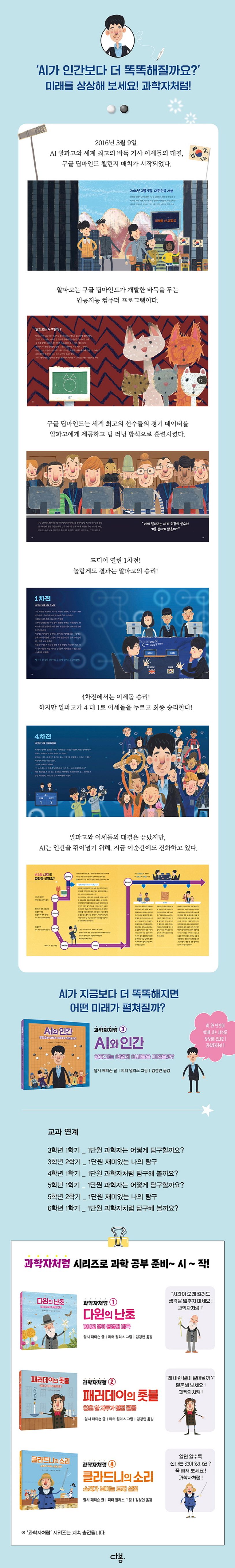 과연 AI가 인간의 능력을 뛰어넘는 세상이 올까요? 《AI와 인간 : 알파고는 이세돌을 어떻게 이겼을까?》는 AI를 대표하는 알파고와 인간을 대표하는 이세돌의 세기의 바둑 대결을 이야기하면서도, AI와 인간을 대결 구도 안에서만 보지 말기를 권합니다. 대신 과학기술의 발달이 우리 생활에 어떤 영향을 끼칠까 생각해 보자고, 인공지능과 인간이 공존하는 미래가 어떨지 상상해 보자고 제안합니다. 과학자처럼!