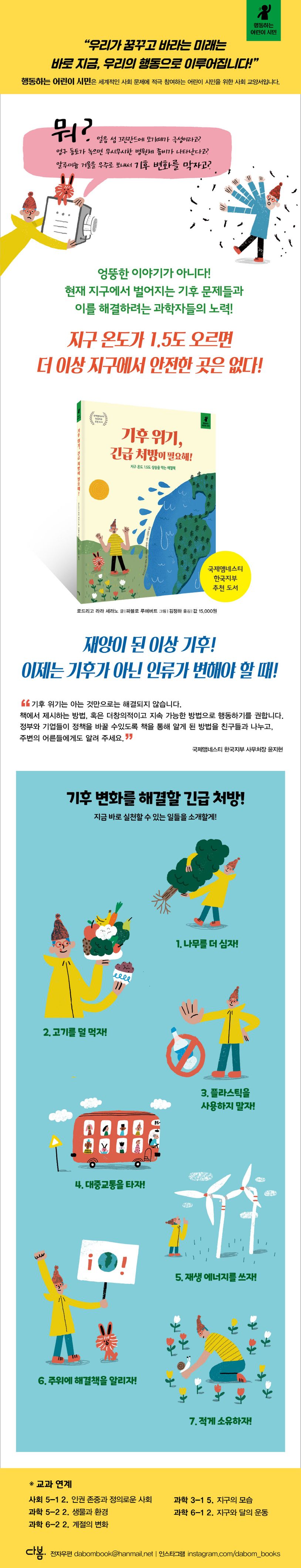 하지만 과학자들은 앞으로 지구 온도가 1.5도 이상 오르면 더 이상 지구에서 안전한 곳은 없다고 했다. 태풍은 전보다 강력해지고 빈번히 발생할 것이고 수많은 생물종이 서식지를 잃고 멸종할 것이다. 해수면이 올라 해안가 도시와 몇몇 섬나라는 수면 아래로 사라져 버릴 테다. 지구에서 사는 한, 기후 위기 상황에서 예외인 사람은 한 명도 없다. 곧 기후 문제는 전 인류가 공동으로 적극적으로 대응해야 한다. 어린이는 당장 무엇을 할 수 있을까?