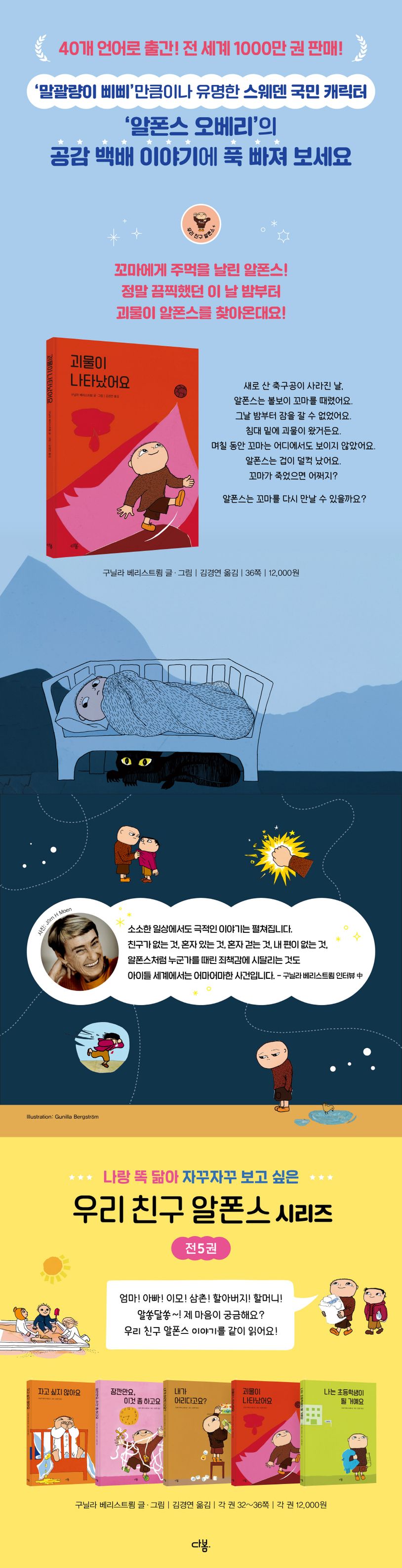 ‘알폰스’의 작가 구닐라 베리스트룀은 ‘말괄량이 삐삐’의 작가 아스트리드 린드그렌, ‘핀두스’의 작가 스벤 누르드크비스트와 함께 스웨덴에서 가장 사랑받는 작가입니다. 2022년 탄생 50주년을 맞는 알폰스 이야기는 약 40개 언어로 번역 출간되었으며, 스웨덴에서는 아동 고전으로 자리 잡으며 지금까지 약 500만 권이 판매되었습니다.
