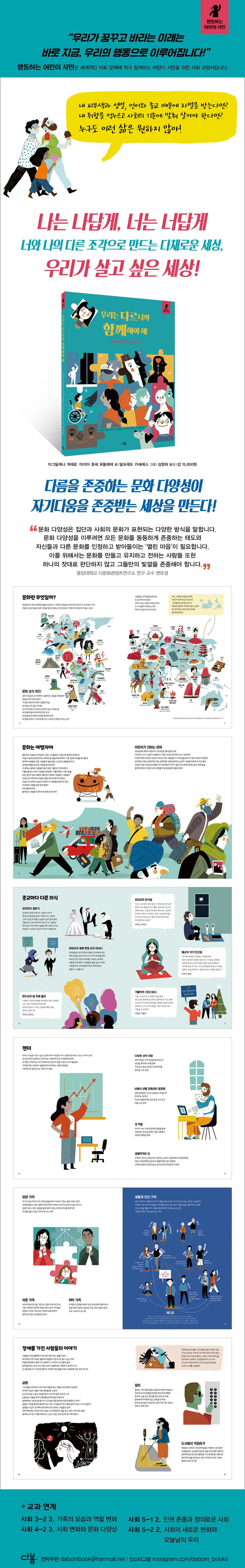 우리나라에 이주한 외국인 수는 160만 명이 넘었고, 다문화 학생 수는 전체 학생의 3퍼센트 이상을 차지한다고 한다. 하지만 다문화 사회에 대한 이해가 다문화 사회로 급격히 변하는 속도를 따라잡지 못하고 있는 것이 현실. 이주 노동자에 대한 부당한 대우, 다문화 가정 아이들을 바라보는 부정적인 선입견과 편견, 성 소수자나 장애인을 비롯한 사회적 약자를 향한 혐오와 무시 등은 국내외 심각한 사회 문제를 만들어 내며 공동체에 균열을 일으키고 있다.