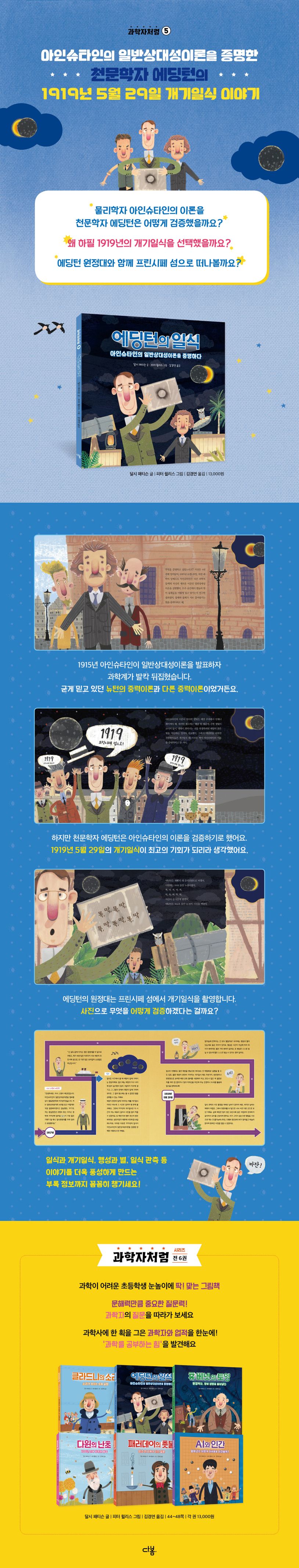 1915년 11월 25일, 알베르트 아인슈타인이 일반상대성이론을 발표하자 과학계가 발칵 뒤집혔습니다. 당시 과학자들은 빛이 일직선으로 이동한다고 생각했는데, 아인슈타인은 태양의 거대한 중력으로 인해 빛이 휘어진다고 했거든요. 이 때문에 실제 별의 위치와 지구에서 바라본 별의 위치가 다르게 보인다고 했죠. 이 새로운 이론을 증명하려면 천문학자들의 도움이 필요한 상황. 이때 천문학자 에딩턴은 1919년 5월 29일에 있을 개기일식이 일반상대성이론을 증명할 최고의 기회라고 생각하고 원정대를 꾸립니다. 에딩턴은 어떻게 일반상대성이론을 증명하려는 걸까요? 왜 개기일식이 일어나는 날을 선택했을까요? 에딩턴에 의해 과학 역사에서 가장 유명한 개기일식으로 기록된 이야기가 과학자처럼 시리즈 다섯 번째 이야기 《에딩턴의 개기일식》에서 펼쳐집니다.