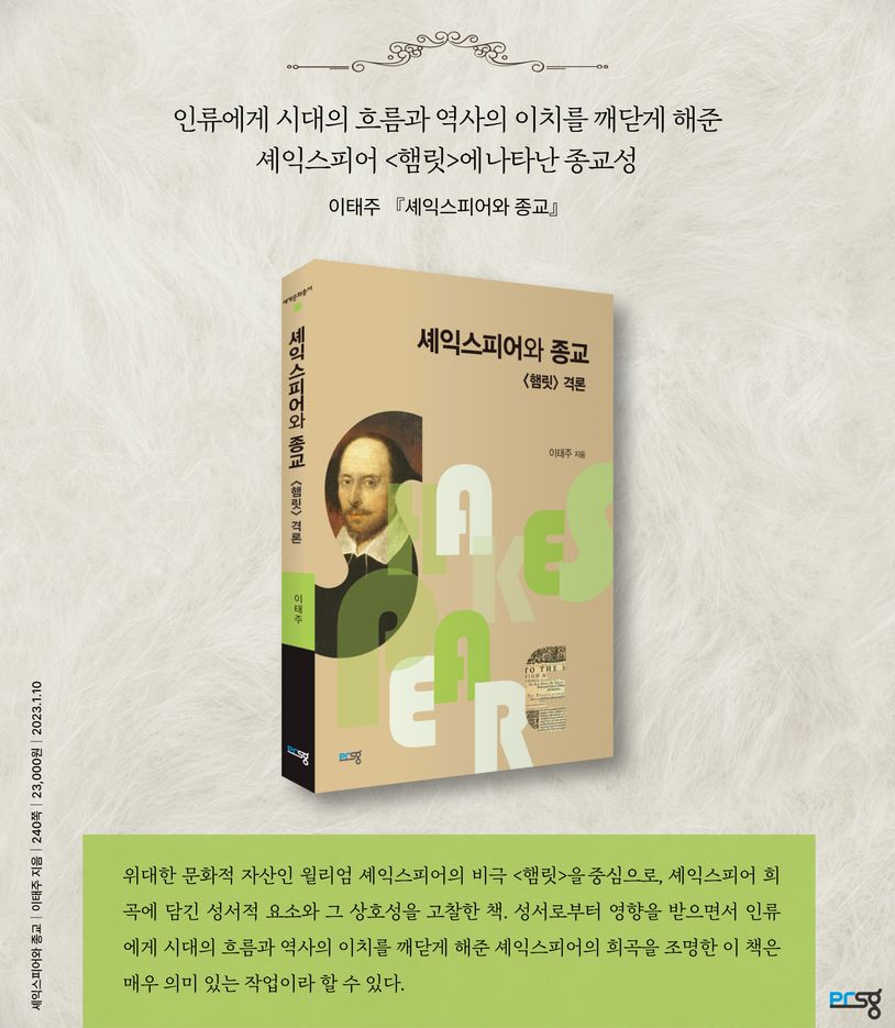 위대한 문화적 자산인 윌리엄 셰익스피어의 비극 〈햄릿〉을 중심으로, 셰익스피어 희곡에 담긴 성서적 요소와 그 상호성을 고찰한 『셰익스피어와 종교』가 푸른생각에서 출간되었다. 성서로부터 영향을 받으면서 인류에게 시대의 흐름과 역사의 이치를 깨닫게 해준 셰익스피어의 희곡을 조명한 이 책은 매우 의미 있는 작업이라 할 수 있다.