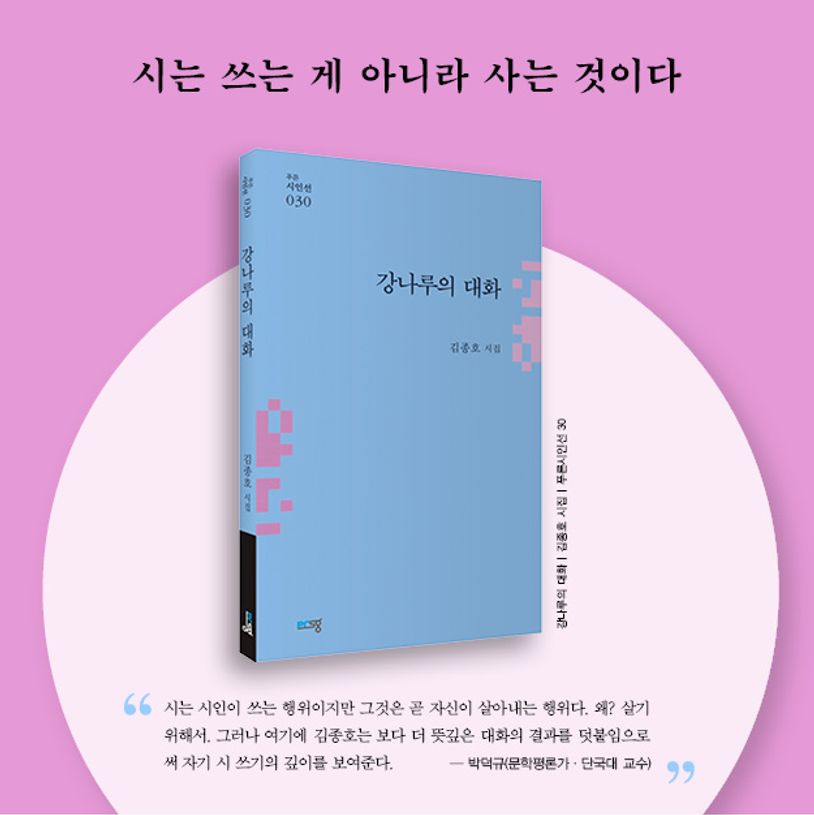 김종호 시인의 제7시집 『강나루의 대화』가 푸른생각의 푸른시인선 30으로 출간되었다. 시인은 인간이라면 피할 수 없는 외로움을 정면으로 마주하고 절망과 고독을 더욱 실존적으로 경험하면서 신(절대자)와 직접적인 관계를 맺으며 내적으로 깊어진 시편들을 보여준다.